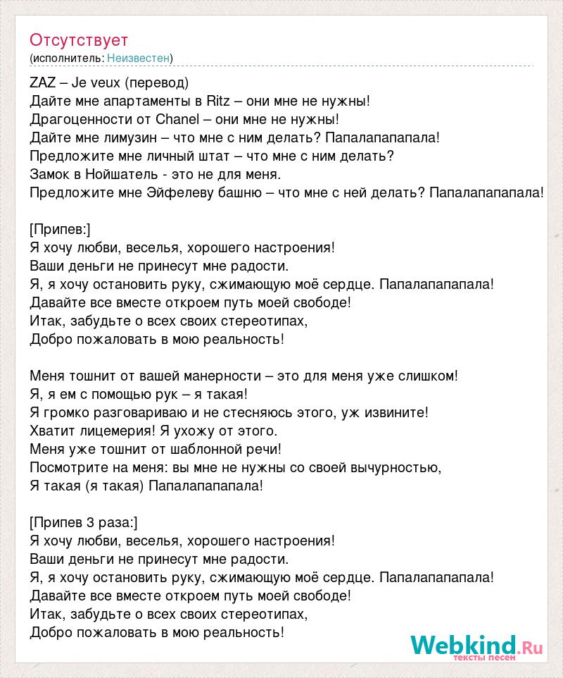 ZAZ – Je veux (перевод) Дайте мне апартаменты в Ritz – они мне не нужны! Драгоценности от Chanel – они мне не нужны! Дайте мне лимузин – что мне с ним делать? Папалапапапала! Предложите мне личный штат – что мне с ним делать? Замок в Нойшатель - это не для меня. Предложите мне Эйфелеву башню – что мне с ней делать? Папалапапапала! [Припев:] Я хочу любви, веселья, хорошего настроения! Ваши деньги не принесут мне радости. Я, я хочу остановить руку, сжимающую моё сердце. Папалапапапала! Давайте все вместе откроем путь моей свободе! Итак, забудьте о всех своих стереотипах, Добро пожаловать в мою реальность! Меня тошнит от вашей манерности – это для меня уже слишком! Я, я ем с помощью рук – я такая! Я громко разговариваю и не стесняюсь этого, уж извините! Хватит лицемерия! Я ухожу от этого. Меня уже тошнит от шаблонной речи! Посмотрите на меня: вы мне не нужны со своей вычурностью, Я такая (я такая) Папалапапапала! [Припев 3 раза:] Я хочу любви, веселья, хорошего настроения! Ваши деньги не принесут мне радости. Я, я хочу остановить руку, сжимающую моё сердце. Папалапапапала! Давайте все вместе откроем путь моей свободе! Итак, забудьте о всех своих стереотипах, Добро пожаловать в мою реальность!