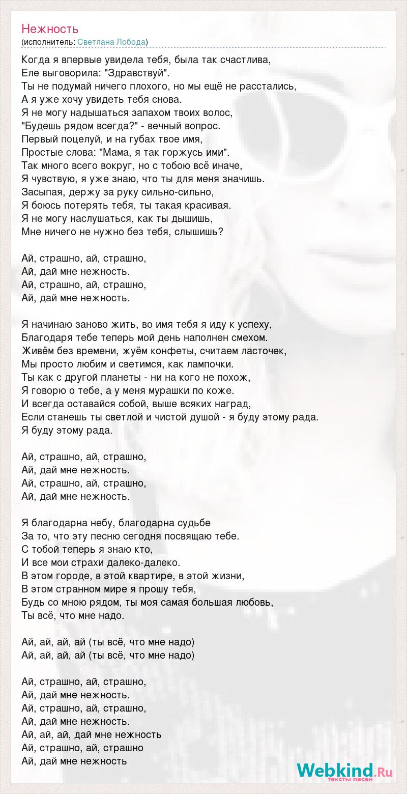 Когда я впервые увидела тебя, была так счастлива, Еле выговорила: "Здравствуй". Ты не подумай ничего плохого, но мы ещё не расстались, А я уже хочу увидеть тебя снова. Я не могу надышаться запахом твоих волос, "Будешь рядом всегда?" - вечный вопрос. Первый поцелуй, и на губах твое имя, Простые слова: "Мама, я так горжусь ими". Так много всего вокруг, но с тобою всё иначе, Я чувствую, я уже знаю, что ты для меня значишь. Засыпая, держу за руку сильно-сильно, Я боюсь потерять тебя, ты такая красивая. Я не могу наслушаться, как ты дышишь, Мне ничего не нужно без тебя, слышишь? Ай, страшно, ай, страшно, Ай, дай мне нежность. Ай, страшно, ай, страшно, Ай, дай мне нежность. Я начинаю заново жить, во имя тебя я иду к успеху, Благодаря тебе теперь мой день наполнен смехом. Живём без времени, жуём конфеты, считаем ласточек, Мы просто любим и светимся, как лампочки. Ты как с другой планеты - ни на кого не похож, Я говорю о тебе, а у меня мурашки по коже. И всегда оставайся собой, выше всяких наград, Если станешь ты светлой и чистой душой - я буду этому рада. Я буду этому рада. Ай, страшно, ай, страшно, Ай, дай мне нежность. Ай, страшно, ай, страшно, Ай, дай мне нежность. Я благодарна небу, благодарна судьбе За то, что эту песню сегодня посвящаю тебе. С тобой теперь я знаю кто, И все мои страхи далеко-далеко. В этом городе, в этой квартире, в этой жизни, В этом странном мире я прошу тебя, Будь со мною рядом, ты моя самая большая любовь, Ты всё, что мне надо. Ай, ай, ай, ай (ты всё, что мне надо) Ай, ай, ай, ай (ты всё, что мне надо) Ай, страшно, ай, страшно, Ай, дай мне нежность. Ай, страшно, ай, страшно, Ай, дай мне нежность. Ай, ай, ай, дай мне нежность Ай, страшно, ай, страшно Ай, дай мне нежность
