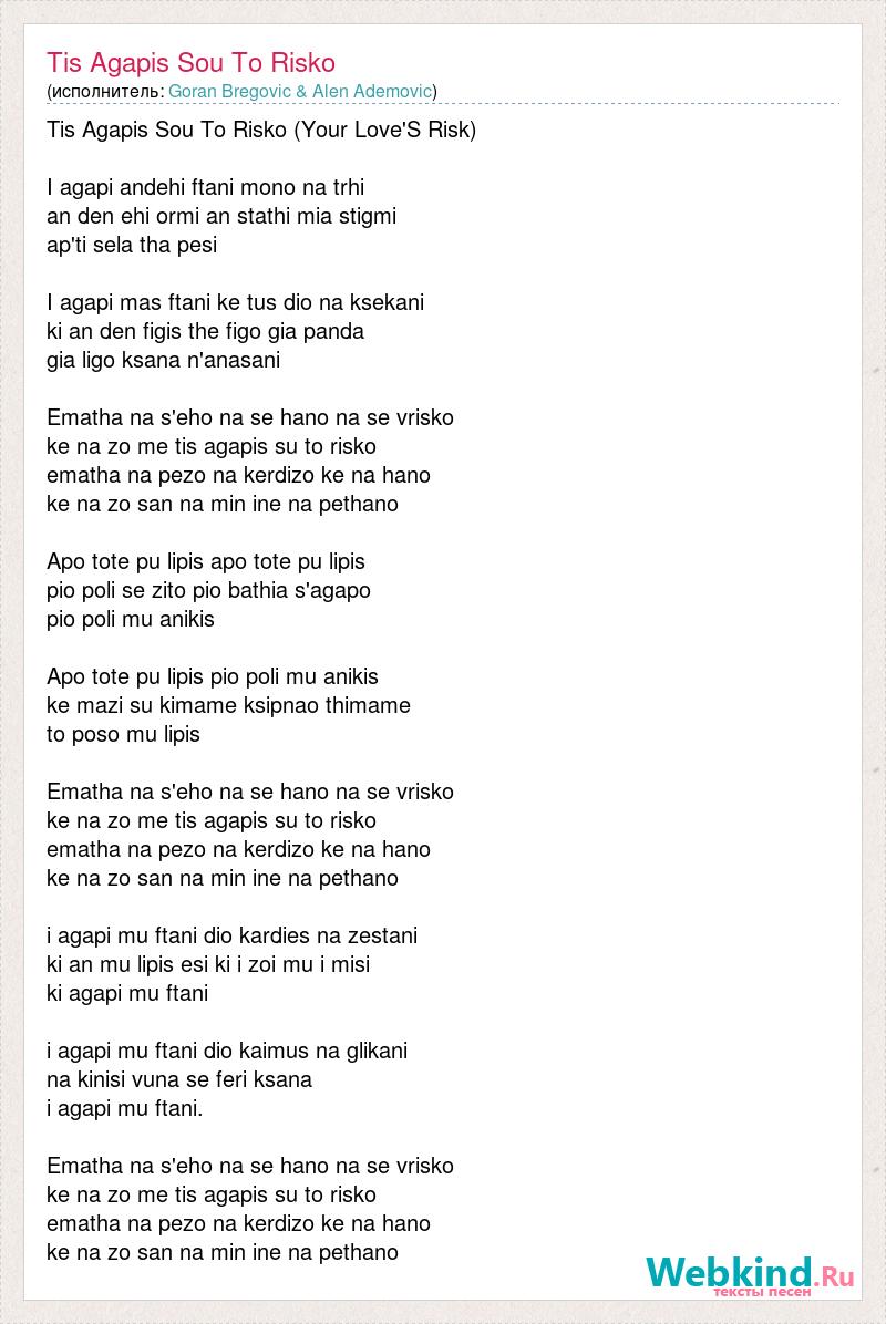 Tis Agapis Sou To Risko (Your Love'S Risk) I agapi andehi ftani mono na trhi an den ehi ormi an stathi mia stigmi ap'ti sela tha pesi I agapi mas ftani ke tus dio na ksekani ki an den figis the figo gia panda gia ligo ksana n'anasani Ematha na s'eho na se hano na se vrisko ke na zo me tis agapis su to risko ematha na pezo na kerdizo ke na hano ke na zo san na min ine na pethano Apo tote pu lipis apo tote pu lipis pio poli se zito pio bathia s'agapo pio poli mu anikis Apo tote pu lipis pio poli mu anikis ke mazi su kimame ksipnao thimame to poso mu lipis Ematha na s'eho na se hano na se vrisko ke na zo me tis agapis su to risko ematha na pezo na kerdizo ke na hano ke na zo san na min ine na pethano i agapi mu ftani dio kardies na zestani ki an mu lipis esi ki i zoi mu i misi ki agapi mu ftani i agapi mu ftani dio kaimus na glikani na kinisi vuna se feri ksana i agapi mu ftani. Ematha na s'eho na se hano na se vrisko ke na zo me tis agapis su to risko ematha na pezo na kerdizo ke na hano ke na zo san na min ine na pethano
