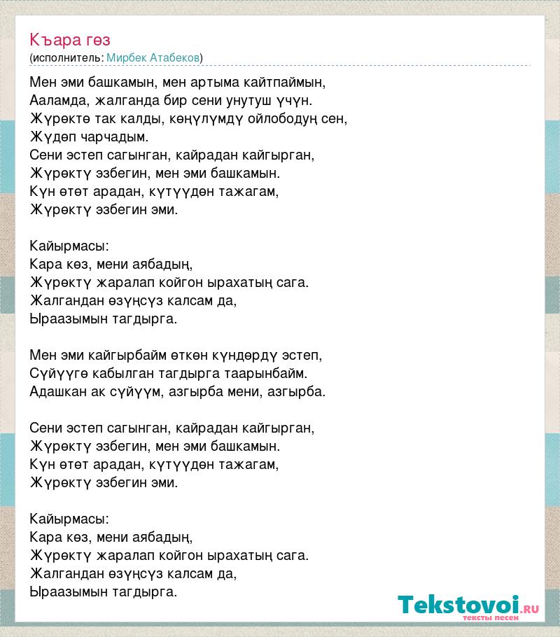 Мен эми башкамын, мен артыма кайтпаймын, Ааламда, жалганда бир сени унутуш үчүн. Жүрөктө так калды, көңүлүмдү ойлободуң сен, Жүдөп чарчадым. Сени эстеп сагынган, кайрадан кайгырган, Жүрөктү эзбегин, мен эми башкамын. Күн өтөт арадан, күтүүдөн тажагам, Жүрөктү эзбегин эми. Кайырмасы: Кара көз, мени аябадың, Жүрөктү жаралап койгон ырахатың сага. Жалгандан өзүңсүз калсам да, Ыраазымын тагдырга. Мен эми кайгырбайм өткөн күндөрдү эстеп, Сүйүүгө кабылган тагдырга таарынбайм. Адашкан ак сүйүүм, азгырба мени, азгырба. Сени эстеп сагынган, кайрадан кайгырган, Жүрөктү эзбегин, мен эми башкамын. Күн өтөт арадан, күтүүдөн тажагам, Жүрөктү эзбегин эми. Кайырмасы: Кара көз, мени аябадың, Жүрөктү жаралап койгон ырахатың сага. Жалгандан өзүңсүз калсам да, Ыраазымын тагдырга.