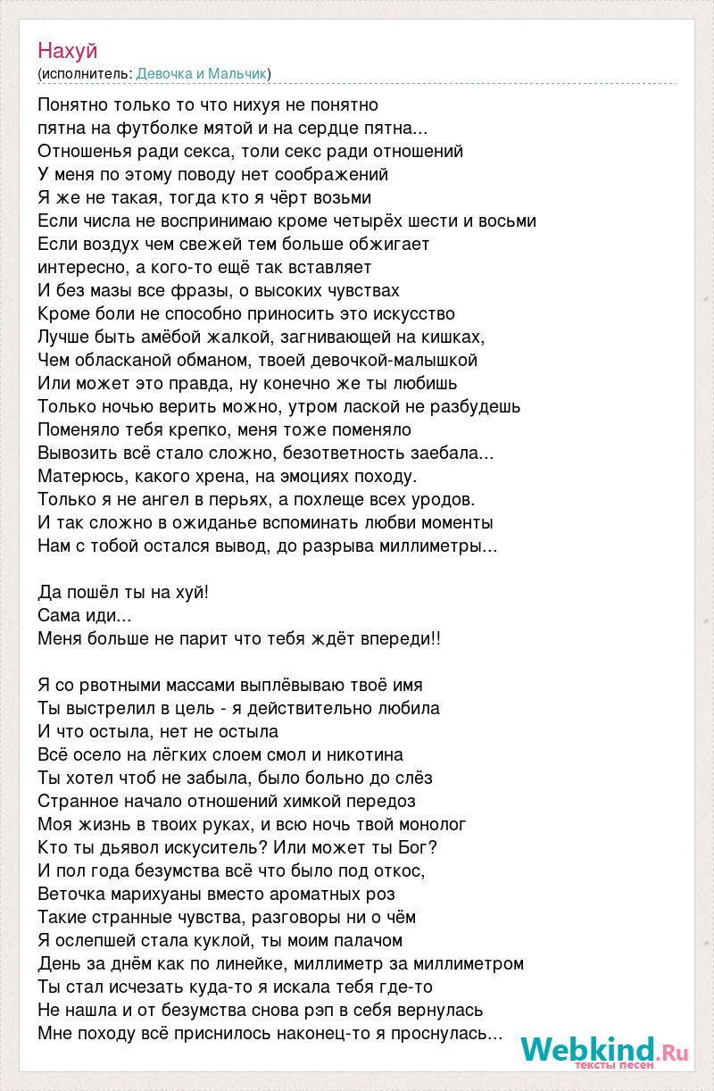Понятно только то что нихуя не понятно пятна на футболке мятой и на сердце пятна... Отношенья ради секса, толи секс ради отношений У меня по этому поводу нет соображений Я же не такая, тогда кто я чёрт возьми Если числа не воспринимаю кроме четырёх шести и восьми Если воздух чем свежей тем больше обжигает интересно, а кого-то ещё так вставляет И без мазы все фразы, о высоких чувствах Кроме боли не способно приносить это искусство Лучше быть амёбой жалкой, загнивающей на кишках, Чем обласканой обманом, твоей девочкой-малышкой Или может это правда, ну конечно же ты любишь Только ночью верить можно, утром лаской не разбудешь Поменяло тебя крепко, меня тоже поменяло Вывозить всё стало сложно, безответность заебала... Матерюсь, какого хрена, на эмоциях походу. Только я не ангел в перьях, а похлеще всех уродов. И так сложно в ожиданье вспоминать любви моменты Нам с тобой остался вывод, до разрыва миллиметры... Да пошёл ты на хуй! Сама иди... Меня больше не парит что тебя ждёт впереди!! Я со рвотными массами выплёвываю твоё имя Ты выстрелил в цель - я действительно любила И что остыла, нет не остыла Всё осело на лёгких слоем смол и никотина Ты хотел чтоб не забыла, было больно до слёз Странное начало отношений химкой передоз Моя жизнь в твоих руках, и всю ночь твой монолог Кто ты дьявол искуситель? Или может ты Бог? И пол года безумства всё что было под откос, Веточка марихуаны вместо ароматных роз Такие странные чувства, разговоры ни о чём Я ослепшей стала куклой, ты моим палачом День за днём как по линейке, миллиметр за миллиметром Ты стал исчезать куда-то я искала тебя где-то Не нашла и от безумства снова рэп в себя вернулась Мне походу всё приснилось наконец-то я проснулась...