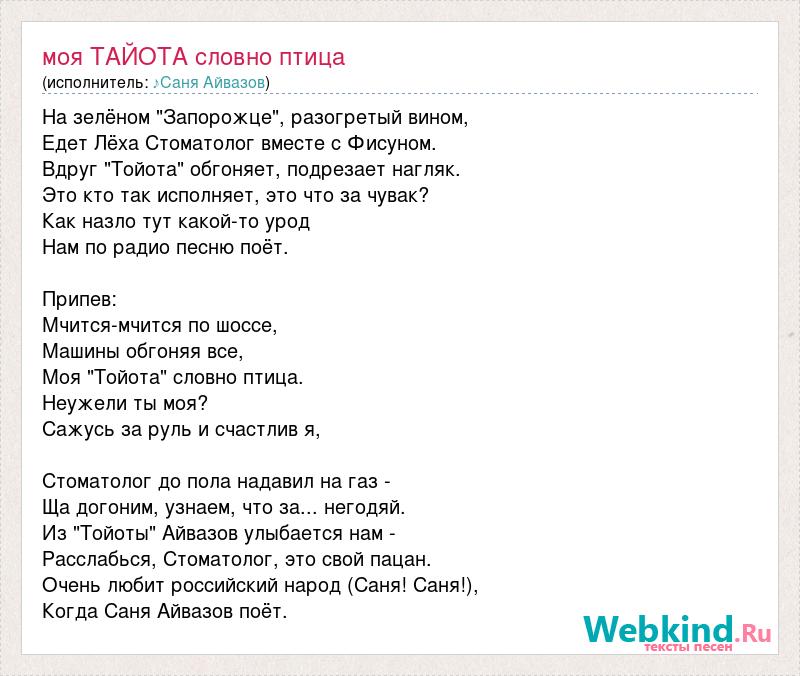 На зелёном "Запорожце", разогретый вином, Едет Лёха Стоматолог вместе с Фисуном. Вдруг "Тойота" обгоняет, подрезает нагляк. Это кто так исполняет, это что за чувак? Как назло тут какой-то урод Нам по радио песню поёт. Припев: Мчится-мчится по шоссе, Машины обгоняя все, Моя "Тойота" словно птица. Неужели ты моя? Сажусь за руль и счастлив я, Стоматолог до пола надавил на газ - Ща догоним, узнаем, что за... негодяй. Из "Тойоты" Айвазов улыбается нам - Расслабься, Стоматолог, это свой пацан. Очень любит российский народ (Саня! Саня!), Когда Саня Айвазов поёт.