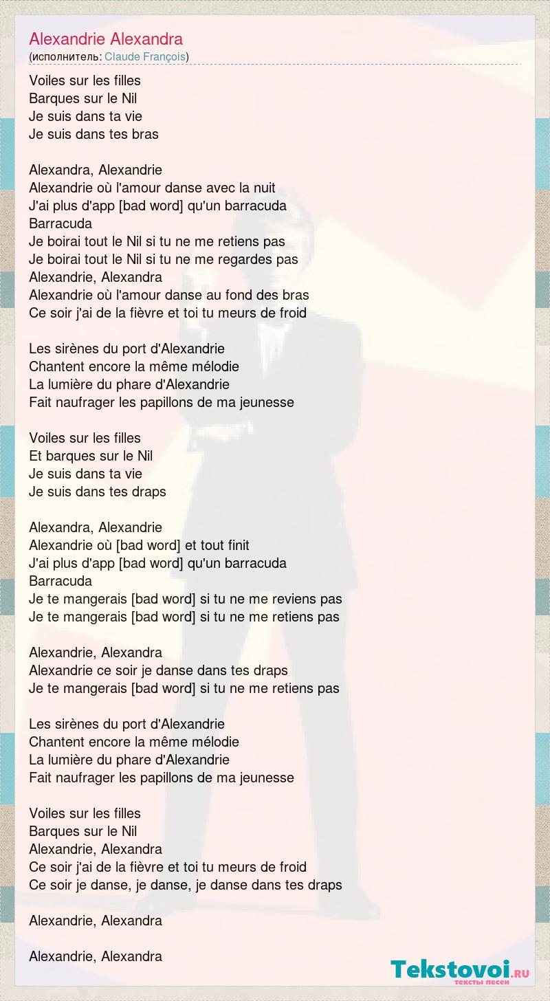 Voiles sur les filles Barques sur le Nil Je suis dans ta vie Je suis dans tes bras Alexandra, Alexandrie Alexandrie où l'amour danse avec la nuit J'ai plus d'app [bad word] qu'un barracuda Barracuda Je boirai tout le Nil si tu ne me retiens pas Je boirai tout le Nil si tu ne me regardes pas Alexandrie, Alexandra Alexandrie où l'amour danse au fond des bras Ce soir j'ai de la fièvre et toi tu meurs de froid Les sirènes du port d'Alexandrie Chantent encore la même mélodie La lumière du phare d'Alexandrie Fait naufrager les papillons de ma jeunesse Voiles sur les filles Et barques sur le Nil Je suis dans ta vie Je suis dans tes draps Alexandra, Alexandrie Alexandrie où tout commence et tout finit J'ai plus d'app [bad word] qu'un barracuda Barracuda Je te mangerais crue si tu ne me reviens pas Je te mangerais crue si tu ne me retiens pas Alexandrie, Alexandra Alexandrie ce soir je danse dans tes draps Je te mangerais crue si tu ne me retiens pas Les sirènes du port d'Alexandrie Chantent encore la même mélodie La lumière du phare d'Alexandrie Fait naufrager les papillons de ma jeunesse Voiles sur les filles Barques sur le Nil Alexandrie, Alexandra Ce soir j'ai de la fièvre et toi tu meurs de froid Ce soir je danse, je danse, je danse dans tes draps Alexandrie, Alexandra Alexandrie, Alexandra