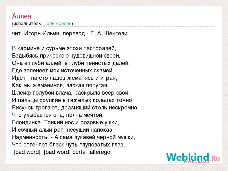 чит. Игорь Ильин, перевод - Г. А. Шенгели В кармине и сурьме эпохи пасторалей, Вздыбясь прическою чудовищной своей, Она в глуби аллей, в глуби тенистых далей, Где зеленеет мох источенных скамей, Идет - на сто ладов жеманясь и играя, Как мы жеманимся, лаская попугая. Шлейф голубой влача, раскрыла веер свой, И пальцы хрупкие в тяжелых кольцах томно Рисунок трогают, дразнящий столь нескромно, Что улыбается она, полна мечтой. Блондинка. Тонкий нос и розовые ушки, И сочный алый рот, несущий напоказ Надменность. - А сама лукавей черной мушки, Что оттеняет блеск чуть глуповатых глаз. [bad word] [bad word] portal_alterego