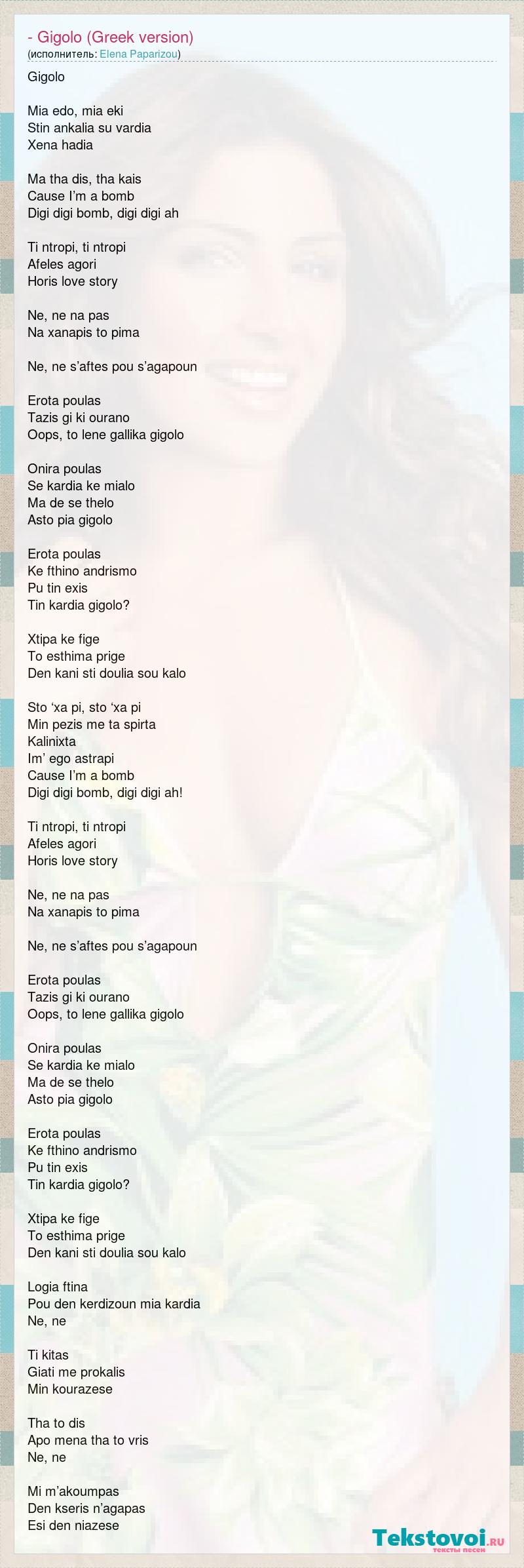 Gigolo Mia edo, mia eki Stin ankalia su vardia Xena hadia Ma tha dis, tha kais Cause I’m a bomb Digi digi bomb, digi digi ah Ti ntropi, ti ntropi Afeles agori Horis love story Ne, ne na pas Na xanapis to pima Ne, ne s’aftes pou s’agapoun Erota poulas Tazis gi ki ourano Oops, to lene gallika gigolo Onira poulas Se kardia ke mialo Ma de se thelo Asto pia gigolo Erota poulas Ke fthino andrismo Pu tin exis Tin kardia gigolo? Xtipa ke fige To esthima prige Den kani sti doulia sou kalo Sto ‘xa pi, sto ‘xa pi Min pezis me ta spirta Kalinixta Im’ ego astrapi Cause I’m a bomb Digi digi bomb, digi digi ah! Ti ntropi, ti ntropi Afeles agori Horis love story Ne, ne na pas Na xanapis to pima Ne, ne s’aftes pou s’agapoun Erota poulas Tazis gi ki ourano Oops, to lene gallika gigolo Onira poulas Se kardia ke mialo Ma de se thelo Asto pia gigolo Erota poulas Ke fthino andrismo Pu tin exis Tin kardia gigolo? Xtipa ke fige To esthima prige Den kani sti doulia sou kalo Logia ftina Pou den kerdizoun mia kardia Ne, ne Ti kitas Giati me prokalis Min kourazese Tha to dis Apo mena tha to vris Ne, ne Mi m’akoumpas Den kseris n’agapas Esi den niazese