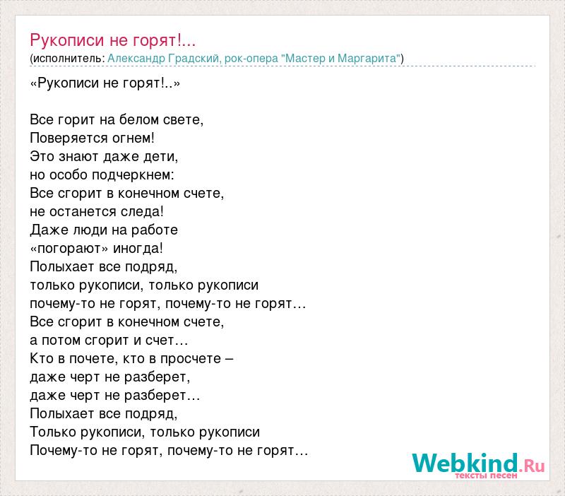 «Рукописи не горят!..» Все горит на белом свете, Поверяется огнем! Это знают даже дети, но особо подчеркнем: Все сгорит в конечном счете, не останется следа! Даже люди на работе «погорают» иногда! Полыхает все подряд, только рукописи, только рукописи почему-то не горят, почему-то не горят… Все сгорит в конечном счете, а потом сгорит и счет… Кто в почете, кто в просчете – даже черт не разберет, даже черт не разберет… Полыхает все подряд, Только рукописи, только рукописи Почему-то не горят, почему-то не горят…
