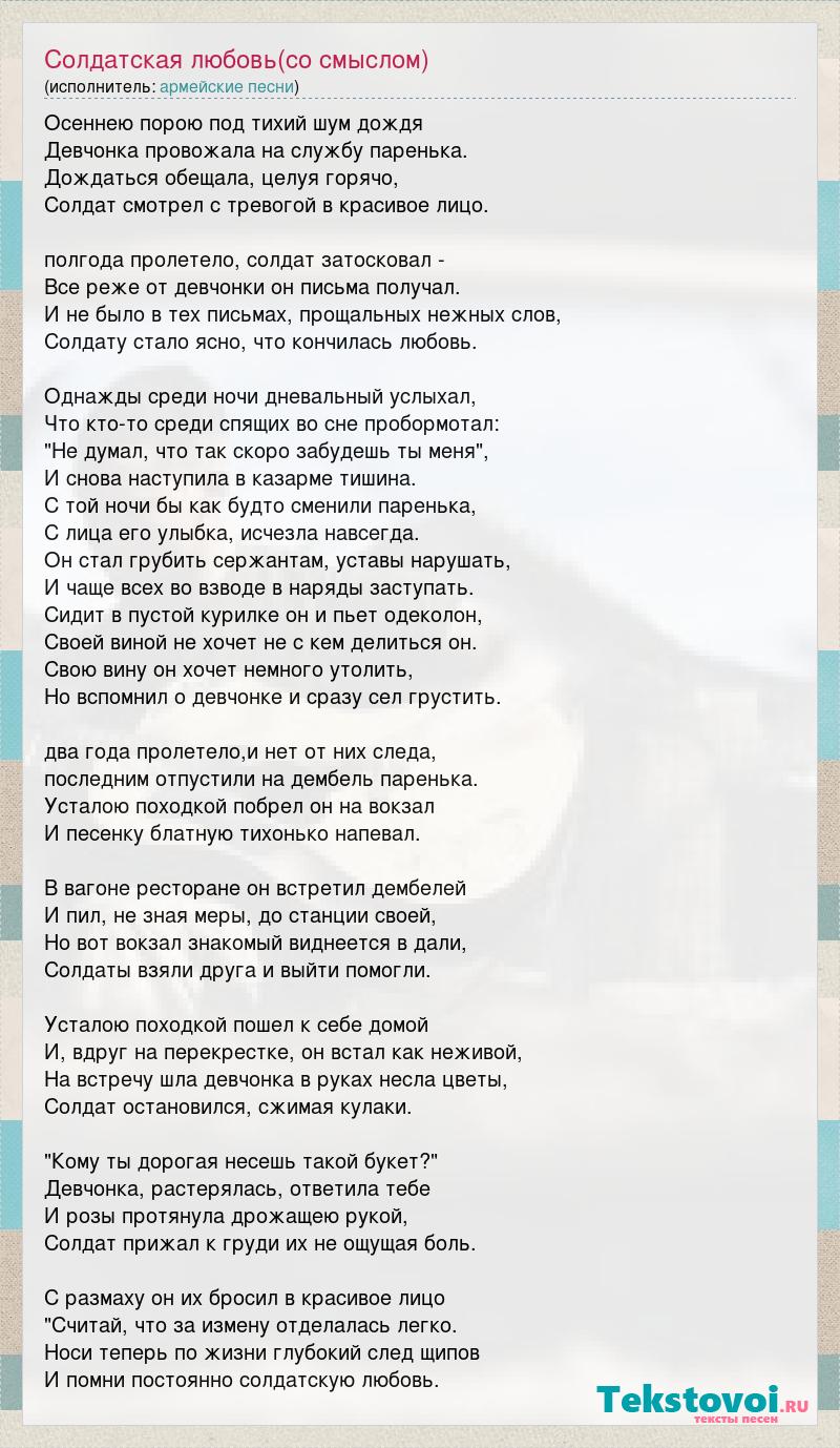 Осеннею порою под тихий шум дождя Девчонка провожала на службу паренька. Дождаться обещала, целуя горячо, Солдат смотрел с тревогой в красивое лицо. полгода пролетело, солдат затосковал - Все реже от девчонки он письма получал. И не было в тех письмах, прощальных нежных слов, Солдату стало ясно, что кончилась любовь. Однажды среди ночи дневальный услыхал, Что кто-то среди спящих во сне пробормотал: "Не думал, что так скоро забудешь ты меня", И снова наступила в казарме тишина. С той ночи бы как будто сменили паренька, С лица его улыбка, исчезла навсегда. Он стал грубить сержантам, уставы нарушать, И чаще всех во взводе в наряды заступать. Сидит в пустой курилке он и пьет одеколон, Своей виной не хочет не с кем делиться он. Свою вину он хочет немного утолить, Но вспомнил о девчонке и сразу сел грустить. два года пролетело,и нет от них следа, последним отпустили на дембель паренька. Усталою походкой побрел он на вокзал И песенку блатную тихонько напевал. В вагоне ресторане он встретил дембелей И пил, не зная меры, до станции своей, Но вот вокзал знакомый виднеется в дали, Солдаты взяли друга и выйти помогли. Усталою походкой пошел к себе домой И, вдруг на перекрестке, он встал как неживой, На встречу шла девчонка в руках несла цветы, Солдат остановился, сжимая кулаки. "Кому ты дорогая несешь такой букет?" Девчонка, растерялась, ответила тебе И розы протянула дрожащею рукой, Солдат прижал к груди их не ощущая боль. С размаху он их бросил в красивое лицо "Считай, что за измену отделалась легко. Носи теперь по жизни глубокий след щипов И помни постоянно солдатскую любовь.