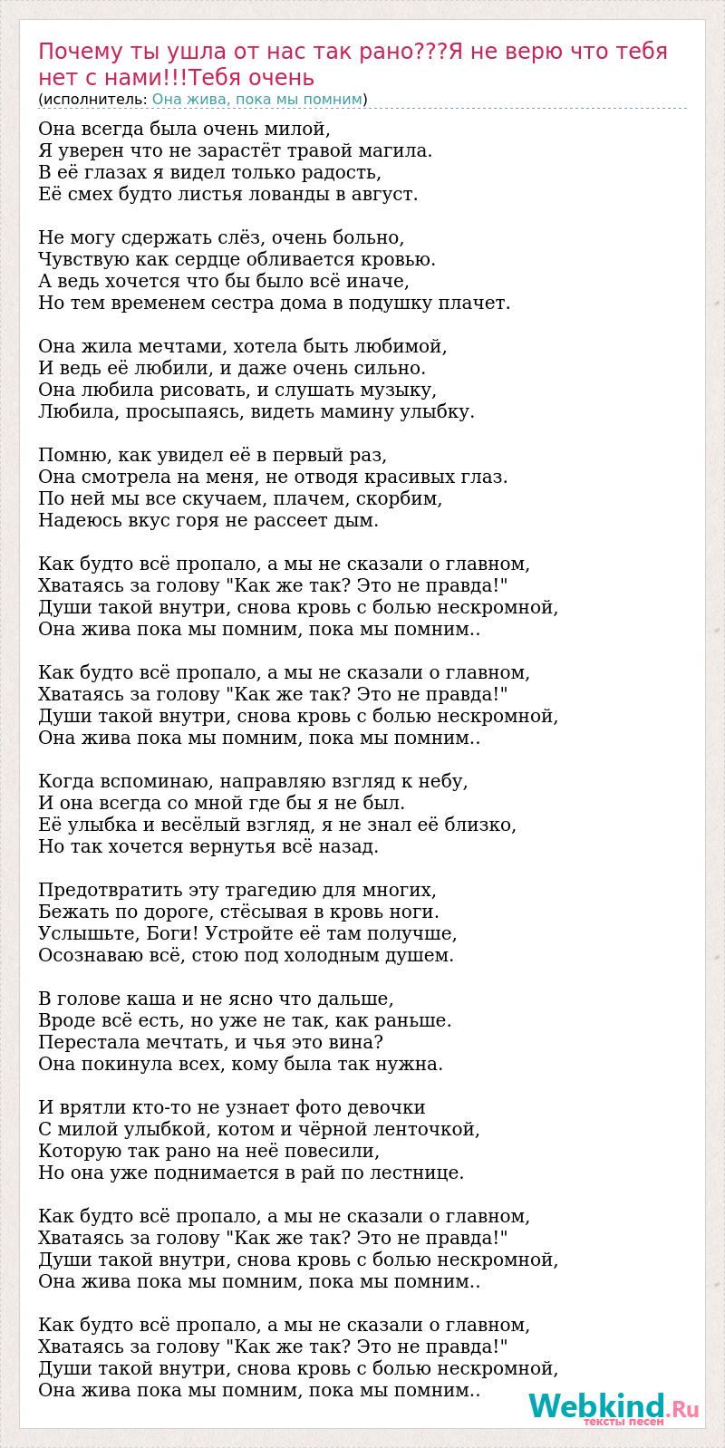 Она всегда была очень милой, Я уверен что не зарастёт травой магила. В её глазах я видел только радость, Её смех будто листья лованды в август. Не могу сдержать слёз, очень больно, Чувствую как сердце обливается кровью. А ведь хочется что бы было всё иначе, Но тем временем сестра дома в подушку плачет. Она жила мечтами, хотела быть любимой, И ведь её любили, и даже очень сильно. Она любила рисовать, и слушать музыку, Любила, просыпаясь, видеть мамину улыбку. Помню, как увидел её в первый раз, Она смотрела на меня, не отводя красивых глаз. По ней мы все скучаем, плачем, скорбим, Надеюсь вкус горя не рассеет дым. Как будто всё пропало, а мы не сказали о главном, Хватаясь за голову "Как же так? Это не правда!" Души такой внутри, снова кровь с болью нескромной, Она жива пока мы помним, пока мы помним.. Как будто всё пропало, а мы не сказали о главном, Хватаясь за голову "Как же так? Это не правда!" Души такой внутри, снова кровь с болью нескромной, Она жива пока мы помним, пока мы помним.. Когда вспоминаю, направляю взгляд к небу, И она всегда со мной где бы я не был. Её улыбка и весёлый взгляд, я не знал её близко, Но так хочется вернутья всё назад. Предотвратить эту трагедию для многих, Бежать по дороге, стёсывая в кровь ноги. Услышьте, Боги! Устройте её там получше, Осознаваю всё, стою под холодным душем. В голове каша и не ясно что дальше, Вроде всё есть, но уже не так, как раньше. Перестала мечтать, и чья это вина? Она покинула всех, кому была так нужна. И врятли кто-то не узнает фото девочки С милой улыбкой, котом и чёрной ленточкой, Которую так рано на неё повесили, Но она уже поднимается в рай по лестнице. Как будто всё пропало, а мы не сказали о главном, Хватаясь за голову "Как же так? Это не правда!" Души такой внутри, снова кровь с болью нескромной, Она жива пока мы помним, пока мы помним.. Как будто всё пропало, а мы не сказали о главном, Хватаясь за голову "Как же так? Это не правда!" Души такой внутри, снова кровь с болью нескромной, Она жива пока мы помним, пока мы помним..