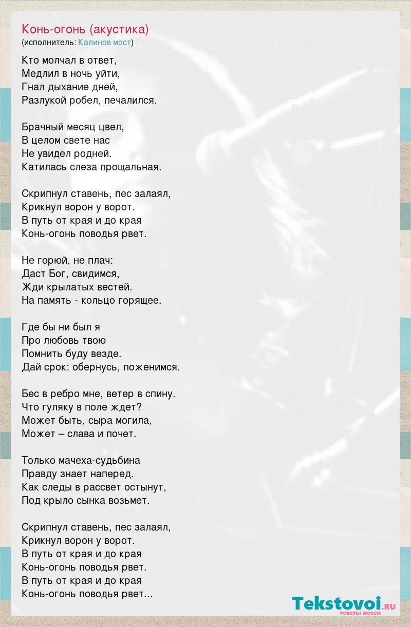 Кто молчал в ответ, Медлил в ночь уйти, Гнал дыхание дней, Разлукой робел, печалился. Брачный месяц цвел, В целом свете нас Не увидел родней. Катилась слеза прощальная. Скрипнул ставень, пес залаял, Крикнул ворон у ворот. В путь от края и до края Конь-огонь поводья рвет. Не горюй, не плач: Даст Бог, свидимся, Жди крылатых вестей. На память - кольцо горящее. Где бы ни был я Про любовь твою Помнить буду везде. Дай срок: обернусь, поженимся. Бес в ребро мне, ветер в спину. Что гуляку в поле ждет? Может быть, сыра могила, Может – слава и почет. Только мачеха-судьбина Правду знает наперед. Как следы в рассвет остынут, Под крыло сынка возьмет. Скрипнул ставень, пес залаял, Крикнул ворон у ворот. В путь от края и до края Конь-огонь поводья рвет. В путь от края и до края Конь-огонь поводья рвет...