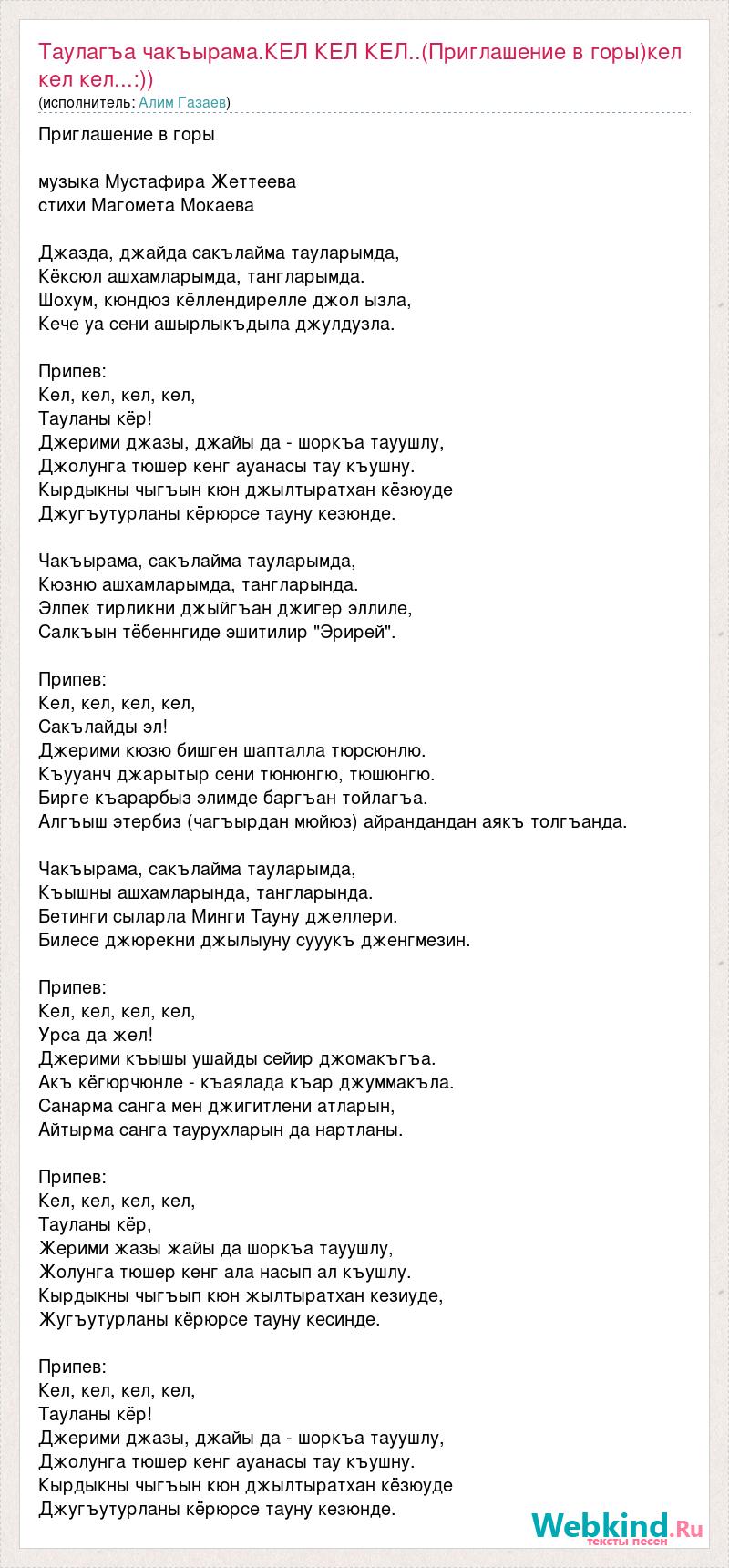 Приглашение в горы музыка Мустафира Жеттеева стихи Магомета Мокаева Джазда, джайда сакълайма тауларымда, Кёксюл ашхамларымда, тангларымда. Шохум, кюндюз кёллендирелле джол ызла, Кече уа сени ашырлыкъдыла джулдузла. Припев: Кел, кел, кел, кел, Тауланы кёр! Джерими джазы, джайы да - шоркъа тауушлу, Джолунга тюшер кенг ауанасы тау къушну. Кырдыкны чыгъын кюн джылтыратхан кёзюуде Джугъутурланы кёрюрсе тауну кезюнде. Чакъырама, сакълайма тауларымда, Кюзню ашхамларымда, тангларында. Элпек тирликни джыйгъан джигер эллиле, Салкъын тёбеннгиде эшитилир "Эрирей". Припев: Кел, кел, кел, кел, Сакълайды эл! Джерими кюзю бишген шапталла тюрсюнлю. Къууанч джарытыр сени тюнюнгю, тюшюнгю. Бирге къарарбыз элимде баргъан тойлагъа. Алгъыш этербиз (чагъырдан мюйюз) айрандандан аякъ толгъанда. Чакъырама, сакълайма тауларымда, Къышны ашхамларында, тангларында. Бетинги сыларла Минги Тауну джеллери. Билесе джюрекни джылыуну сууукъ дженгмезин. Припев: Кел, кел, кел, кел, Урса да жел! Джерими къышы ушайды сейир джомакъгъа. Акъ кёгюрчюнле - къаялада къар джуммакъла. Санарма санга мен джигитлени атларын, Айтырма санга таурухларын да нартланы. Припев: Кел, кел, кел, кел, Тауланы кёр, Жерими жазы жайы да шоркъа тауушлу, Жолунга тюшер кенг ала насып ал къушлу. Кырдыкны чыгъып кюн жылтыратхан кезиуде, Жугъутурланы кёрюрсе тауну кесинде. Припев: Кел, кел, кел, кел, Тауланы кёр! Джерими джазы, джайы да - шоркъа тауушлу, Джолунга тюшер кенг ауанасы тау къушну. Кырдыкны чыгъын кюн джылтыратхан кёзюуде Джугъутурланы кёрюрсе тауну кезюнде.