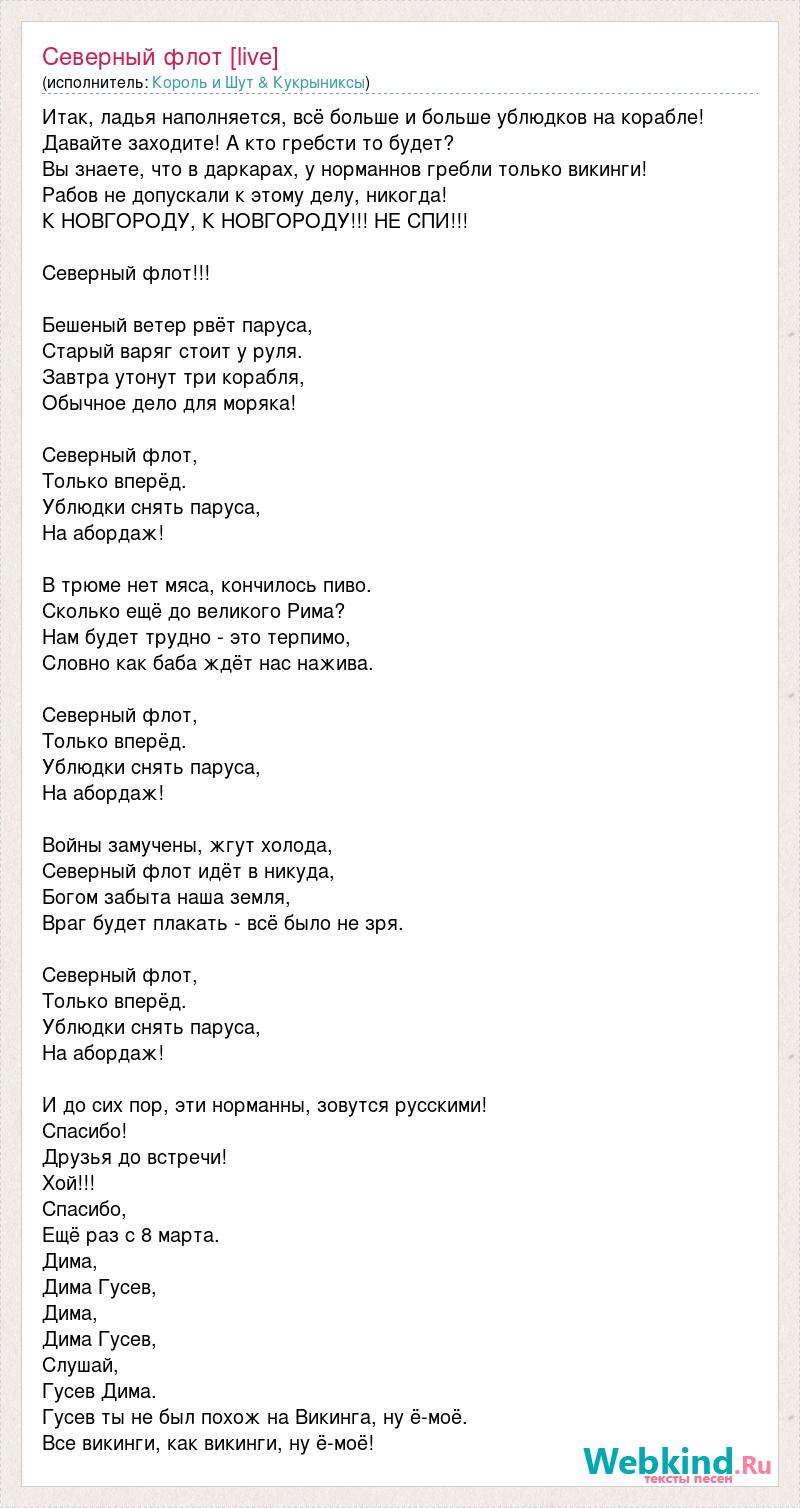 Итак, ладья наполняется, всё больше и больше ублюдков на корабле! Давайте заходите! А кто гребсти то будет? Вы знаете, что в даркарах, у норманнов гребли только викинги! Рабов не допускали к этому делу, никогда! К НОВГОРОДУ, К НОВГОРОДУ!!! НЕ СПИ!!! Северный флот!!! Бешеный ветер рвёт паруса, Старый варяг стоит у руля. Завтра утонут три корабля, Обычное дело для моряка! Северный флот, Только вперёд. Ублюдки снять паруса, На абордаж! В трюме нет мяса, кончилось пиво. Сколько ещё до великого Рима? Нам будет трудно - это терпимо, Словно как баба ждёт нас нажива. Северный флот, Только вперёд. Ублюдки снять паруса, На абордаж! Войны замучены, жгут холода, Северный флот идёт в никуда, Богом забыта наша земля, Враг будет плакать - всё было не зря. Северный флот, Только вперёд. Ублюдки снять паруса, На абордаж! И до сих пор, эти норманны, зовутся русскими! Спасибо! Друзья до встречи! Хой!!! Спасибо, Ещё раз с 8 марта. Дима, Дима Гусев, Дима, Дима Гусев, Слушай, Гусев Дима. Гусев ты не был похож на Викинга, ну ё-моё. Все викинги, как викинги, ну ё-моё!