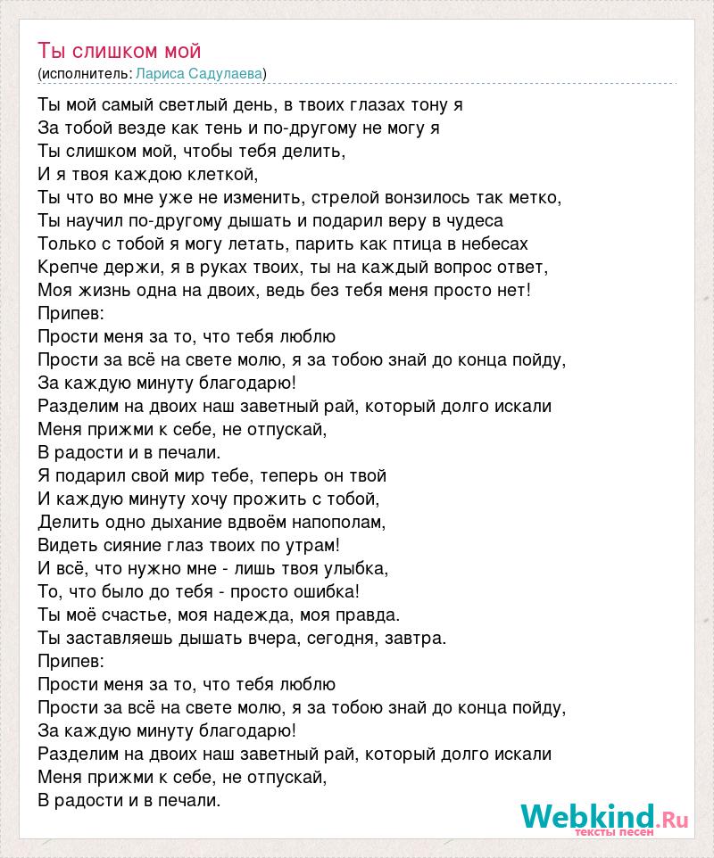 Ты мой самый светлый день, в твоих глазах тону я За тобой везде как тень и по-другому не могу я Ты слишком мой, чтобы тебя делить, И я твоя каждою клеткой, Ты что во мне уже не изменить, стрелой вонзилось так метко, Ты научил по-другому дышать и подарил веру в чудеса Только с тобой я могу летать, парить как птица в небесах Крепче держи, я в руках твоих, ты на каждый вопрос ответ, Моя жизнь одна на двоих, ведь без тебя меня просто нет! Припев: Прости меня за то, что тебя люблю Прости за всё на свете молю, я за тобою знай до конца пойду, За каждую минуту благодарю! Разделим на двоих наш заветный рай, который долго искали Меня прижми к себе, не отпускай, В радости и в печали. Я подарил свой мир тебе, теперь он твой И каждую минуту хочу прожить с тобой, Делить одно дыхание вдвоём напополам, Видеть сияние глаз твоих по утрам! И всё, что нужно мне - лишь твоя улыбка, То, что было до тебя - просто ошибка! Ты моё счастье, моя надежда, моя правда. Ты заставляешь дышать вчера, сегодня, завтра. Припев: Прости меня за то, что тебя люблю Прости за всё на свете молю, я за тобою знай до конца пойду, За каждую минуту благодарю! Разделим на двоих наш заветный рай, который долго искали Меня прижми к себе, не отпускай, В радости и в печали.