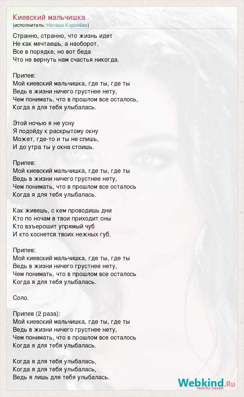 Странно, странно, что жизнь идет Не как мечтаешь, а наоборот. Все в порядке, но вот беда Что не вернуть нам счастья никогда. Припев: Мой киевский мальчишка, где ты, где ты Ведь в жизни ничего грустнее нету, Чем понимать, что в прошлом все осталось, Когда я для тебя улыбалась. Этой ночью я не усну Я подойду к раскрытому окну Может, где-то и ты не спишь, И до утра ты у окна стоишь. Припев: Мой киевский мальчишка, где ты, где ты Ведь в жизни ничего грустнее нету, Чем понимать, что в прошлом все осталось Когда я для тебя улыбалась. Как живешь, с кем проводишь дни Кто по ночам в твои приходит сны Кто взъерошит упрямый чуб И кто коснется твоих нежных губ. Припев: Мой киевский мальчишка, где ты, где ты Ведь в жизни ничего грустнее нету, Чем понимать, что в прошлом все осталось Когда я для тебя улыбалась. Соло. Припев (2 раза): Мой киевский мальчишка, где ты, где ты Ведь в жизни ничего грустнее нету, Чем понимать, что в прошлом все осталось Когда я для тебя улыбалась. Когда я для тебя улыбалась, Когда я для тебя улыбалась, Ведь я лишь для тебя улыбалась.