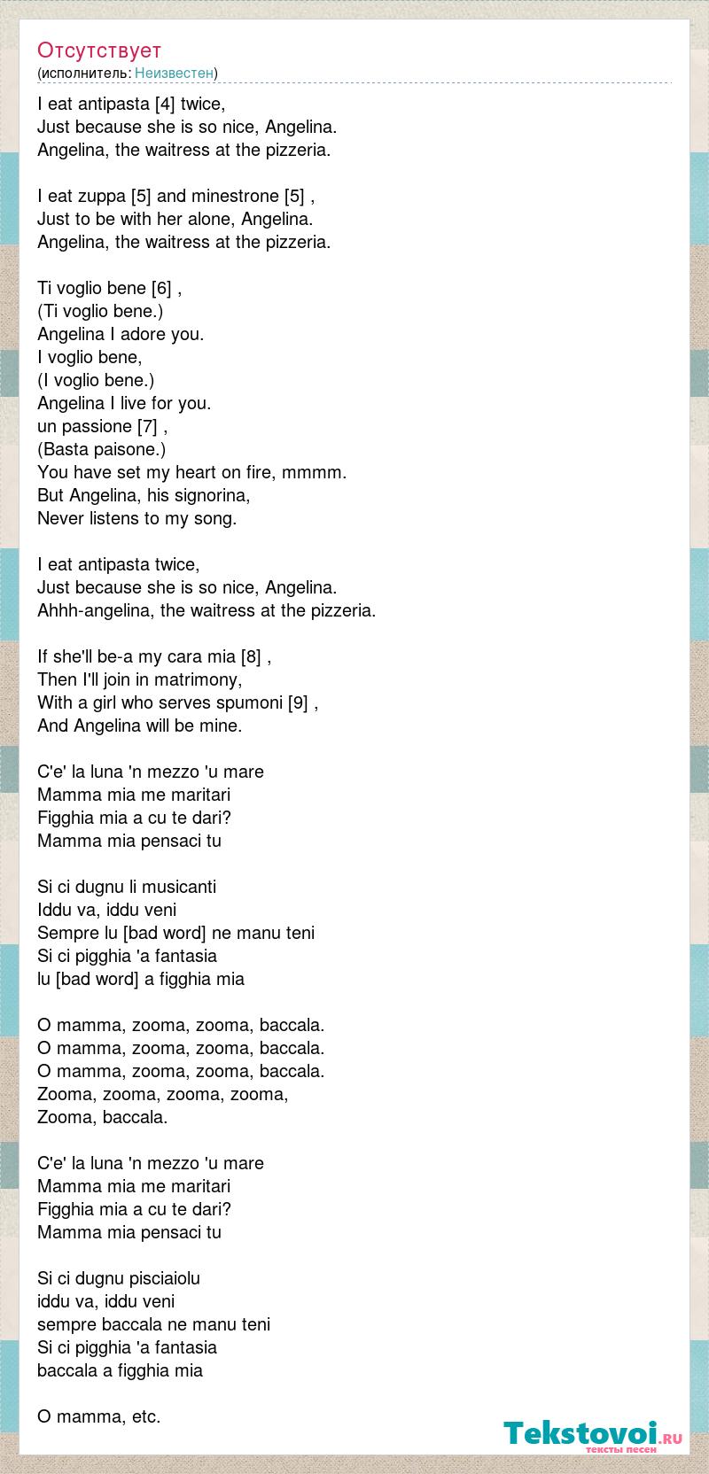 I eat antipasta [4] twice, Just because she is so nice, Angelina. Angelina, the waitress at the pizzeria. I eat zuppa [5] and minestrone [5] , Just to be with her alone, Angelina. Angelina, the waitress at the pizzeria. Ti voglio bene [6] , (Ti voglio bene.) Angelina I adore you. I voglio bene, (I voglio bene.) Angelina I live for you. un passione [7] , (Basta paisone.) You have set my heart on fire, mmmm. But Angelina, his signorina, Never listens to my song. I eat antipasta twice, Just because she is so nice, Angelina. Ahhh-angelina, the waitress at the pizzeria. If she'll be-a my cara mia [8] , Then I'll join in matrimony, With a girl who serves spumoni [9] , And Angelina will be mine. C'e' la luna 'n mezzo 'u mare Mamma mia me maritari Figghia mia a cu te dari? Mamma mia pensaci tu Si ci dugnu li musicanti Iddu va, iddu veni Sempre lu strumento ne manu teni Si ci pigghia 'a fantasia lu strumento a figghia mia O mamma, zooma, zooma, baccala. O mamma, zooma, zooma, baccala. O mamma, zooma, zooma, baccala. Zooma, zooma, zooma, zooma, Zooma, baccala. C'e' la luna 'n mezzo 'u mare Mamma mia me maritari Figghia mia a cu te dari? Mamma mia pensaci tu Si ci dugnu pisciaiolu iddu va, iddu veni sempre baccala ne manu teni Si ci pigghia 'a fantasia baccala a figghia mia O mamma, etc.