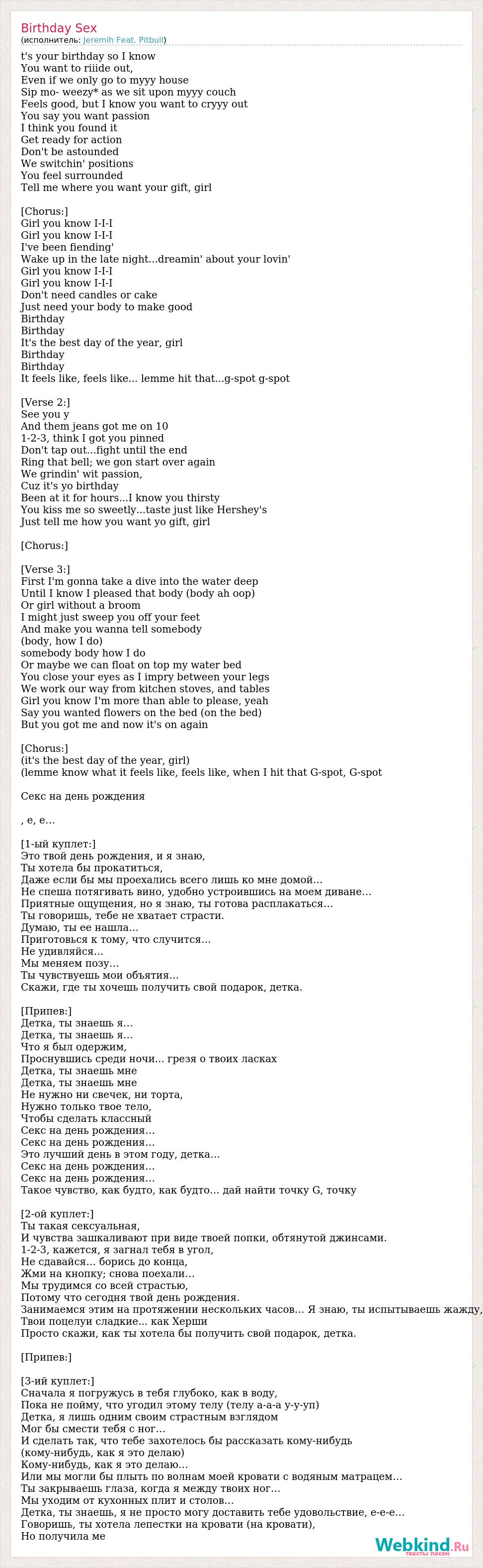 t's your birthday so I know You want to riiide out, Even if we only go to myyy house Sip mo- weezy* as we sit upon myyy couch Feels good, but I know you want to cryyy out You say you want passion I think you found it Get ready for action Don't be astounded We switchin' positions You feel surrounded Tell me where you want your gift, girl [Chorus:] Girl you know I-I-I Girl you know I-I-I I've been fiending' Wake up in the late night...dreamin' about your lovin' Girl you know I-I-I Girl you know I-I-I Don't need candles or cake Just need your body to make good Birthday Birthday It's the best day of the year, girl Birthday Birthday It feels like, feels like... lemme hit that...g-spot g-spot [Verse 2:] See you y And them jeans got me on 10 1-2-3, think I got you pinned Don't tap out...fight until the end Ring that bell; we gon start over again We grindin' wit passion, Cuz it's yo birthday Been at it for hours...I know you thirsty You kiss me so sweetly...taste just like Hershey's Just tell me how you want yo gift, girl [Chorus:] [Verse 3:] First I'm gonna take a dive into the water deep Until I know I pleased that body (body ah oop) Or girl without a broom I might just sweep you off your feet And make you wanna tell somebody (body, how I do) somebody body how I do Or maybe we can float on top my water bed You close your eyes as I impry between your legs We work our way from kitchen stoves, and tables Girl you know I'm more than able to please, yeah Say you wanted flowers on the bed (on the bed) But you got me and now it's on again [Chorus:] (it's the best day of the year, girl) (lemme know what it feels like, feels like, when I hit that G-spot, G-spot Секс на день рождения , е, е… [1-ый куплет:] Это твой день рождения, и я знаю, Ты хотела бы прокатиться, Даже если бы мы проехались всего лишь ко мне домой… Не спеша потягивать вино, удобно устроившись на моем диване… Приятные ощущения, но я знаю, ты готова расплакаться… Ты говоришь, тебе не хватает страсти. Думаю, ты ее нашла… Приготовься к тому, что случится… Не удивляйся… Мы меняем позу… Ты чувствуешь мои объятия… Скажи, где ты хочешь получить свой подарок, детка. [Припев:] Детка, ты знаешь я… Детка, ты знаешь я… Что я был одержим, Проснувшись среди ночи... грезя о твоих ласках Детка, ты знаешь мне Детка, ты знаешь мне Не нужно ни свечек, ни торта, Нужно только твое тело, Чтобы сделать классный Секс на день рождения… Секс на день рождения… Это лучший день в этом году, детка… Секс на день рождения… Секс на день рождения… Такое чувство, как будто, как будто… дай найти точку G, точку [2-ой куплет:] Ты такая сексуальная, И чувства зашкаливают при виде твоей попки, обтянутой джинсами. 1-2-3, кажется, я загнал тебя в угол, Не сдавайся… борись до конца, Жми на кнопку; снова поехали… Мы трудимся со всей страстью, Потому что сегодня твой день рождения. Занимаемся этим на протяжении нескольких часов… Я знаю, ты испытываешь жажду, Твои поцелуи сладкие... как Херши Просто скажи, как ты хотела бы получить свой подарок, детка. [Припев:] [3-ий куплет:] Сначала я погружусь в тебя глубоко, как в воду, Пока не пойму, что угодил этому телу (телу а-а-а у-у-уп) Детка, я лишь одним своим страстным взглядом Мог бы смести тебя с ног… И сделать так, что тебе захотелось бы рассказать кому-нибудь (кому-нибудь, как я это делаю) Кому-нибудь, как я это делаю… Или мы могли бы плыть по волнам моей кровати с водяным матрацем… Ты закрываешь глаза, когда я между твоих ног… Мы уходим от кухонных плит и столов… Детка, ты знаешь, я не просто могу доставить тебе удовольствие, е-е-е… Говоришь, ты хотела лепестки на кровати (на кровати), Но получила ме