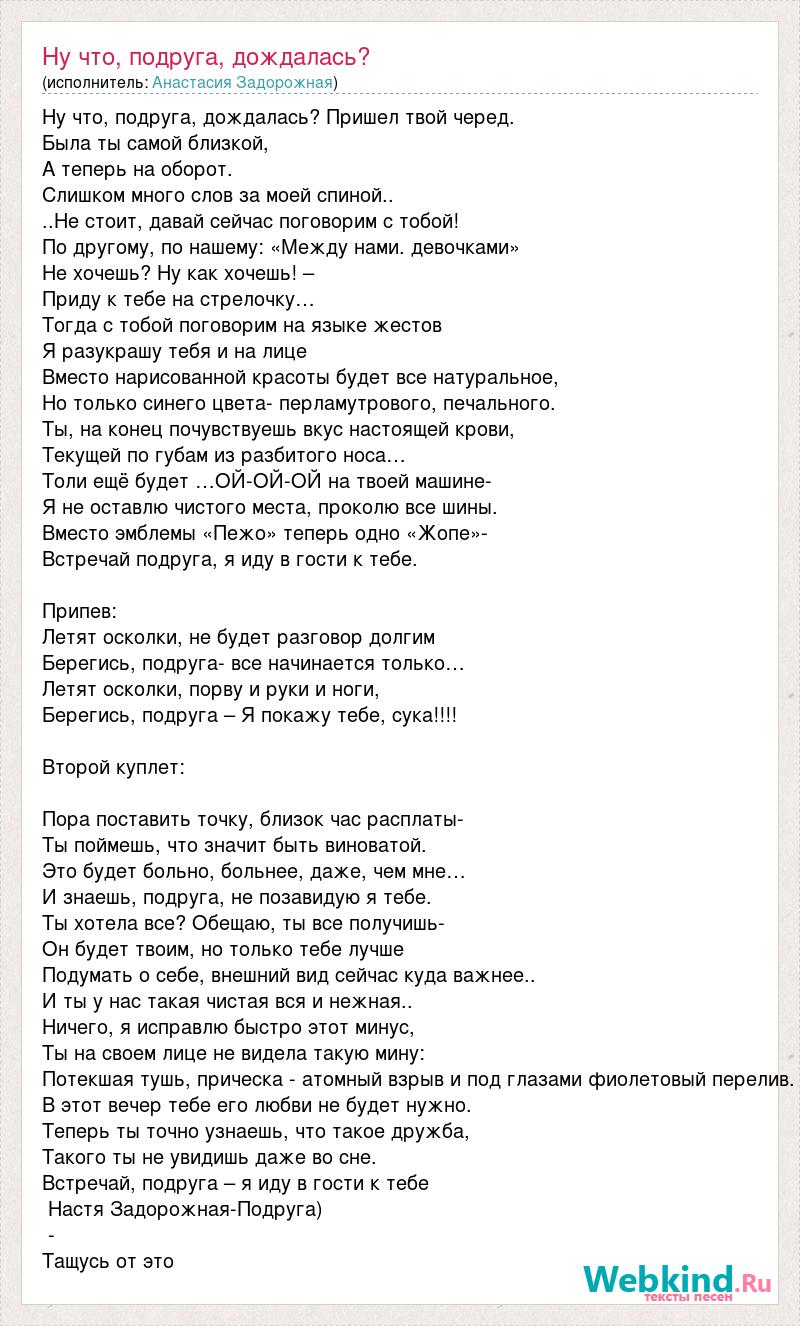 Ну что, подруга, дождалась? Пришел твой черед. Была ты самой близкой, А теперь на оборот. Слишком много слов за моей спиной.. ..Не стоит, давай сейчас поговорим с тобой! По другому, по нашему: «Между нами. девочками» Не хочешь? Ну как хочешь! – Приду к тебе на стрелочку… Тогда с тобой поговорим на языке жестов Я разукрашу тебя и на лице Вместо нарисованной красоты будет все натуральное, Но только синего цвета- перламутрового, печального. Ты, на конец почувствуешь вкус настоящей крови, Текущей по губам из разбитого носа… Толи ещё будет …ОЙ-ОЙ-ОЙ на твоей машине- Я не оставлю чистого места, проколю все шины. Вместо эмблемы «Пежо» теперь одно «Жопе»- Встречай подруга, я иду в гости к тебе. Припев: Летят осколки, не будет разговор долгим Берегись, подруга- все начинается только… Летят осколки, порву и руки и ноги, Берегись, подруга – Я покажу тебе, сука!!!! Второй куплет: Пора поставить точку, близок час расплаты- Ты поймешь, что значит быть виноватой. Это будет больно, больнее, даже, чем мне… И знаешь, подруга, не позавидую я тебе. Ты хотела все? Обещаю, ты все получишь- Он будет твоим, но только тебе лучше Подумать о себе, внешний вид сейчас куда важнее.. И ты у нас такая чистая вся и нежная.. Ничего, я исправлю быстро этот минус, Ты на своем лице не видела такую мину: Потекшая тушь, прическа - атомный взрыв и под глазами фиолетовый перелив. В этот вечер тебе его любви не будет нужно. Теперь ты точно узнаешь, что такое дружба, Такого ты не увидишь даже во сне. Встречай, подруга – я иду в гости к тебе Настя Задорожная-Подруга) - Тащусь от это