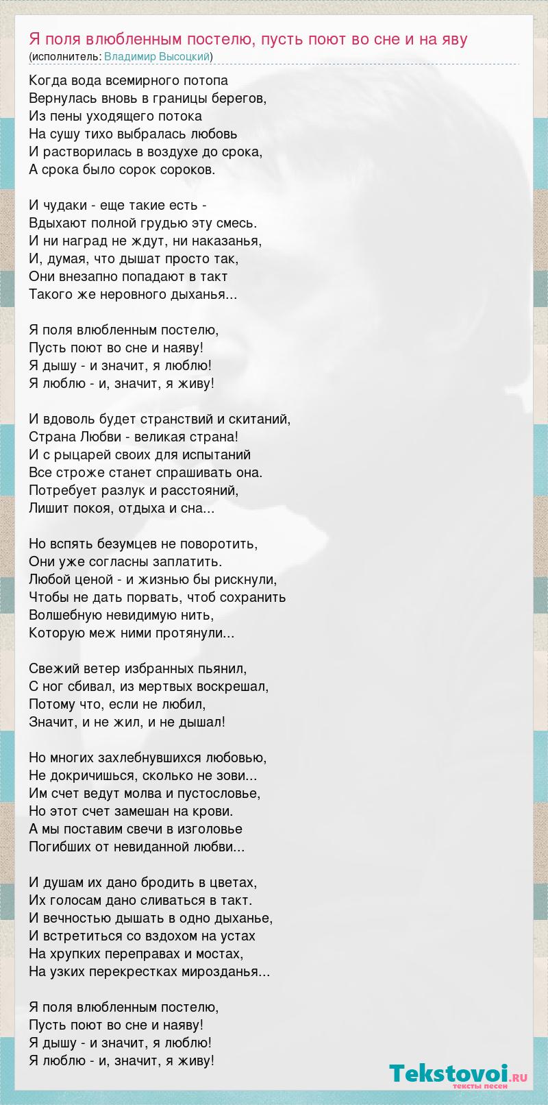 Когда вода всемирного потопа Вернулась вновь в границы берегов, Из пены уходящего потока На сушу тихо выбралась любовь И растворилась в воздухе до срока, А срока было сорок сороков. И чудаки - еще такие есть - Вдыхают полной грудью эту смесь. И ни наград не ждут, ни наказанья, И, думая, что дышат просто так, Они внезапно попадают в такт Такого же неровного дыханья... Я поля влюбленным постелю, Пусть поют во сне и наяву! Я дышу - и значит, я люблю! Я люблю - и, значит, я живу! И вдоволь будет странствий и скитаний, Страна Любви - великая страна! И с рыцарей своих для испытаний Все строже станет спрашивать она. Потребует разлук и расстояний, Лишит покоя, отдыха и сна... Но вспять безумцев не поворотить, Они уже согласны заплатить. Любой ценой - и жизнью бы рискнули, Чтобы не дать порвать, чтоб сохранить Волшебную невидимую нить, Которую меж ними протянули... Свежий ветер избранных пьянил, С ног сбивал, из мертвых воскрешал, Потому что, если не любил, Значит, и не жил, и не дышал! Но многих захлебнувшихся любовью, Не докричишься, сколько не зови... Им счет ведут молва и пустословье, Но этот счет замешан на крови. А мы поставим свечи в изголовье Погибших от невиданной любви... И душам их дано бродить в цветах, Их голосам дано сливаться в такт. И вечностью дышать в одно дыханье, И встретиться со вздохом на устах На хрупких переправах и мостах, На узких перекрестках мирозданья... Я поля влюбленным постелю, Пусть поют во сне и наяву! Я дышу - и значит, я люблю! Я люблю - и, значит, я живу!