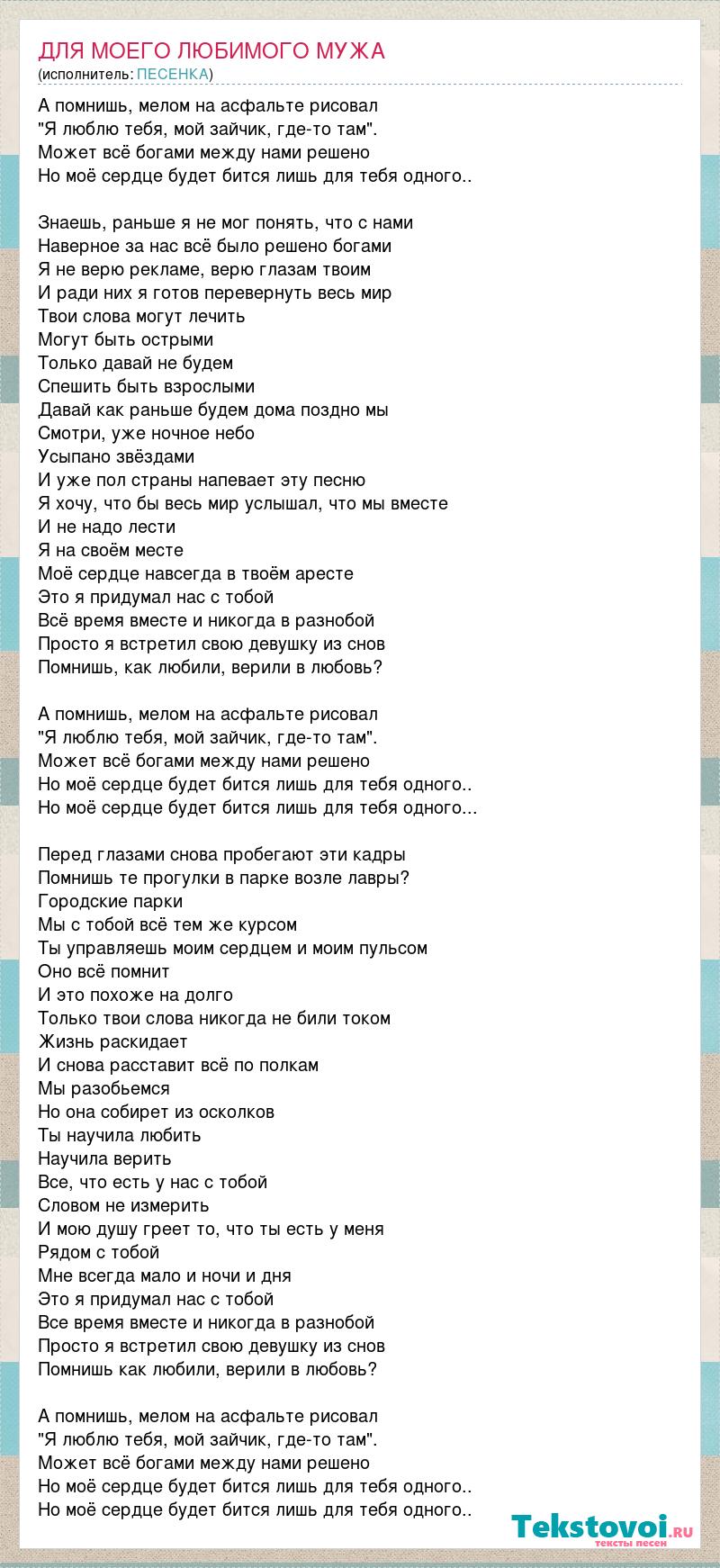 А помнишь, мелом на асфальте рисовал "Я люблю тебя, мой зайчик, где-то там". Может всё богами между нами решено Но моё сердце будет бится лишь для тебя одного.. Знаешь, раньше я не мог понять, что с нами Наверное за нас всё было решено богами Я не верю рекламе, верю глазам твоим И ради них я готов перевернуть весь мир Твои слова могут лечить Могут быть острыми Только давай не будем Спешить быть взрослыми Давай как раньше будем дома поздно мы Смотри, уже ночное небо Усыпано звёздами И уже пол страны напевает эту песню Я хочу, что бы весь мир услышал, что мы вместе И не надо лести Я на своём месте Моё сердце навсегда в твоём аресте Это я придумал нас с тобой Всё время вместе и никогда в разнобой Просто я встретил свою девушку из снов Помнишь, как любили, верили в любовь? А помнишь, мелом на асфальте рисовал "Я люблю тебя, мой зайчик, где-то там". Может всё богами между нами решено Но моё сердце будет бится лишь для тебя одного.. Но моё сердце будет бится лишь для тебя одного... Перед глазами снова пробегают эти кадры Помнишь те прогулки в парке возле лавры? Городские парки Мы с тобой всё тем же курсом Ты управляешь моим сердцем и моим пульсом Оно всё помнит И это похоже на долго Только твои слова никогда не били током Жизнь раскидает И снова расставит всё по полкам Мы разобьемся Но она собирет из осколков Ты научила любить Научила верить Все, что есть у нас с тобой Словом не измерить И мою душу греет то, что ты есть у меня Рядом с тобой Мне всегда мало и ночи и дня Это я придумал нас с тобой Все время вместе и никогда в разнобой Просто я встретил свою девушку из снов Помнишь как любили, верили в любовь? А помнишь, мелом на асфальте рисовал "Я люблю тебя, мой зайчик, где-то там". Может всё богами между нами решено Но моё сердце будет бится лишь для тебя одного.. Но моё сердце будет бится лишь для тебя одного..
