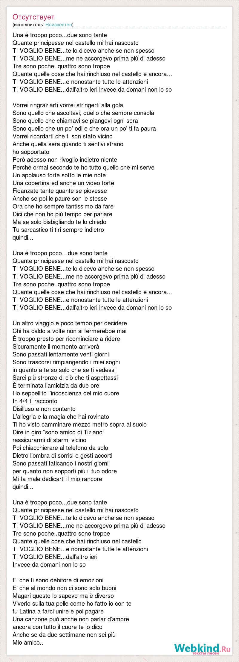 Una è troppo poco...due sono tante Quante principesse nel castello mi hai nascosto TI VOGLIO BENE...te lo dicevo anche se non spesso TI VOGLIO BENE...me ne accorgevo prima più di adesso Tre sono poche..quattro sono troppe Quante quelle cose che hai rinchiuso nel castello e ancora… TI VOGLIO BENE...e nonostante tutte le attenzioni TI VOGLIO BENE...dall’altro ieri invece da domani non lo so Vorrei ringraziarti vorrei stringerti alla gola Sono quello che ascoltavi, quello che sempre consola Sono quello che chiamavi se piangevi ogni sera Sono quello che un po’ odi e che ora un po’ ti fa paura Vorrei ricordarti che ti son stato vicino Anche quella sera quando ti sentivi strano ho sopportato Però adesso non rivoglio indietro niente Perché ormai secondo te ho tutto quello che mi serve Un applauso forte sotto le mie note Una copertina ed anche un video forte Fidanzate tante quante se piovesse Anche se poi le paure son le stesse Ora che ho sempre tantissimo da fare Dici che non ho più tempo per parlare Ma se solo bisbigliando te lo chiedo Tu sarcastico ti tiri sempre indietro quindi... Una è troppo poco…due sono tante Quante principesse nel castello mi hai nascosto TI VOGLIO BENE...te lo dicevo anche se non spesso TI VOGLIO BENE...me ne accorgevo prima più di adesso Tre sono poche..quattro sono troppe Quante quelle cose che hai rinchiuso nel castello e ancora... TI VOGLIO BENE...e nonostante tutte le attenzioni TI VOGLIO BENE...dall’altro ieri invece da domani non lo so Un altro viaggio e poco tempo per decidere Chi ha caldo a volte non si fermerebbe mai È troppo presto per ricominciare a ridere Sicuramente il momento arriverà Sono passati lentamente venti giorni Sono trascorsi rimpiangendo i miei sogni in quanto a te so solo che se ti vedessi Sarei più stronzo di ciò che ti aspettassi È terminata l’amicizia da due ore Ho seppellito l’incoscienza del mio cuore In 4/4 ti racconto Disilluso e non contento L’allegria e la magia che hai rovinato Ti ho visto camminare mezzo metro sopra al suolo Dire in giro “sono amico di Tiziano” rassicurarmi di starmi vicino Poi chiacchierare al telefono da solo Dietro l’ombra di sorrisi e gesti accorti Sono passati faticando i nostri giorni per quanto non sopporti più il tuo odore Mi fa male dedicarti il mio rancore quindi... Una è troppo poco...due sono tante Quante principesse nel castello mi hai nascosto TI VOGLIO BENE...te lo dicevo anche se non spesso TI VOGLIO BENE...me ne accorgevo prima più di adesso Tre sono poche..quattro sono troppe Quante quelle cose che hai rinchiuso nel castello TI VOGLIO BENE...e nonostante tutte le attenzioni TI VOGLIO BENE...dall’altro ieri Invece da domani non lo so E’ che ti sono debitore di emozioni E’ che al mondo non ci sono solo buoni Magari questo lo sapevo ma è diverso Viverlo sulla tua pelle come ho fatto io con te fu Latina a farci unire e poi pagare Una canzone può anche non parlar d’amore ancora con tutto il cuore te lo dico Anche se da due settimane non sei più Mio amico..