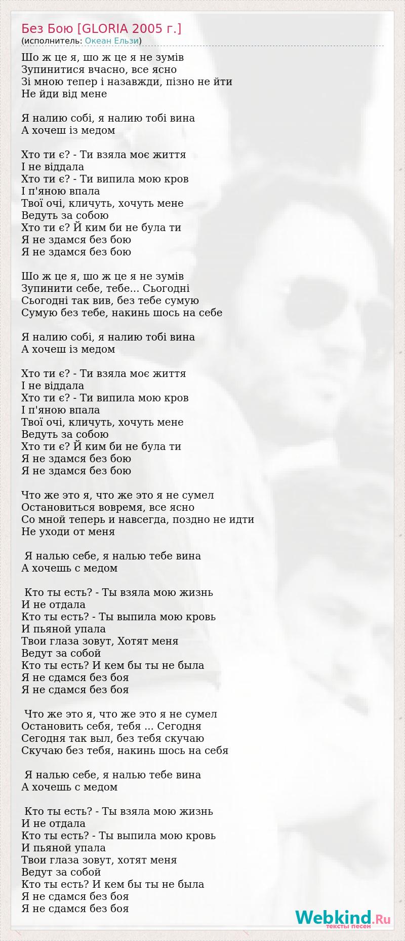 Шо ж це я, шо ж це я не зумів Зупинитися вчасно, все ясно Зі мною тепер і назавжди, пізно не йти Не йди від мене Я налию собі, я налию тобі вина А хочеш із медом Хто ти є? - Ти взяла моє життя І не віддала Хто ти є? - Ти випила мою кров І п'яною впала Твої очі, кличуть, хочуть мене Ведуть за собою Хто ти є? Й ким би не була ти Я не здамся без бою Я не здамся без бою Шо ж це я, шо ж це я не зумів Зупинити себе, тебе... Сьогодні Сьогодні так вив, без тебе сумую Сумую без тебе, накинь шось на себе Я налию собі, я налию тобі вина А хочеш із медом Хто ти є? - Ти взяла моє життя І не віддала Хто ти є? - Ти випила мою кров І п'яною впала Твої очі, кличуть, хочуть мене Ведуть за собою Хто ти є? Й ким би не була ти Я не здамся без бою Я не здамся без бою Что же это я, что же это я не сумел Остановиться вовремя, все ясно Со мной теперь и навсегда, поздно не идти Не уходи от меня Я налью себе, я налью тебе вина А хочешь с медом Кто ты есть? - Ты взяла мою жизнь И не отдала Кто ты есть? - Ты выпила мою кровь И пьяной упала Твои глаза зовут, Хотят меня Ведут за собой Кто ты есть? И кем бы ты не была Я не сдамся без боя Я не сдамся без боя Что же это я, что же это я не сумел Остановить себя, тебя ... Сегодня Сегодня так выл, без тебя скучаю Скучаю без тебя, накинь шось на себя Я налью себе, я налью тебе вина А хочешь с медом Кто ты есть? - Ты взяла мою жизнь И не отдала Кто ты есть? - Ты выпила мою кровь И пьяной упала Твои глаза зовут, хотят меня Ведут за собой Кто ты есть? И кем бы ты не была Я не сдамся без боя Я не сдамся без боя