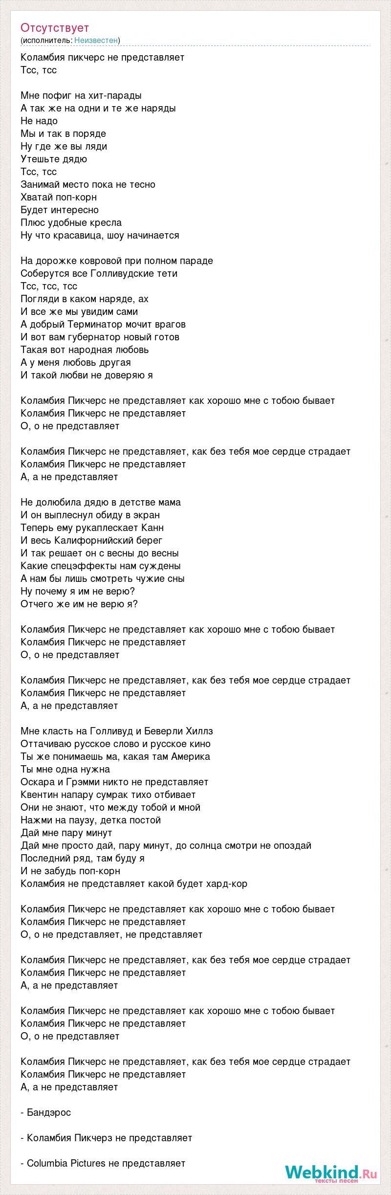 Коламбия пикчерс не представляет Тсс, тсс Мне пофиг на хит-парады А так же на одни и те же наряды Не надо Мы и так в поряде Ну где же вы ляди Утешьте дядю Тсс, тсс Занимай место пока не тесно Хватай поп-корн Будет интересно Плюс удобные кресла Ну что красавица, шоу начинается На дорожке ковровой при полном параде Соберутся все Голливудские тети Тсс, тсс, тсс Погляди в каком наряде, ах И все же мы увидим сами А добрый Терминатор мочит врагов И вот вам губернатор новый готов Такая вот народная любовь А у меня любовь другая И такой любви не доверяю я Коламбия Пикчерс не представляет как хорошо мне с тобою бывает Коламбия Пикчерс не представляет О, о не представляет Коламбия Пикчерс не представляет, как без тебя мое сердце страдает Коламбия Пикчерс не представляет А, а не представляет Не долюбила дядю в детстве мама И он выплеснул обиду в экран Теперь ему рукаплескает Канн И весь Калифорнийский берег И так решает он с весны до весны Какие спецэффекты нам суждены А нам бы лишь смотреть чужие сны Ну почему я им не верю? Отчего же им не верю я? Коламбия Пикчерс не представляет как хорошо мне с тобою бывает Коламбия Пикчерс не представляет О, о не представляет Коламбия Пикчерс не представляет, как без тебя мое сердце страдает Коламбия Пикчерс не представляет А, а не представляет Мне класть на Голливуд и Беверли Хиллз Оттачиваю русское слово и русское кино Ты же понимаешь ма, какая там Америка Ты мне одна нужна Оскара и Грэмми никто не представляет Квентин напару сумрак тихо отбивает Они не знают, что между тобой и мной Нажми на паузу, детка постой Дай мне пару минут Дай мне просто дай, пару минут, до солнца смотри не опоздай Последний ряд, там буду я И не забудь поп-корн Коламбия не представляет какой будет хард-кор Коламбия Пикчерс не представляет как хорошо мне с тобою бывает Коламбия Пикчерс не представляет О, о не представляет, не представляет Коламбия Пикчерс не представляет, как без тебя мое сердце страдает Коламбия Пикчерс не представляет А, а не представляет Коламбия Пикчерс не представляет как хорошо мне с тобою бывает Коламбия Пикчерс не представляет О, о не представляет Коламбия Пикчерс не представляет, как без тебя мое сердце страдает Коламбия Пикчерс не представляет А, а не представляет - Бандэрос - Коламбия Пикчерз не представляет - Columbia Pictures не представляет