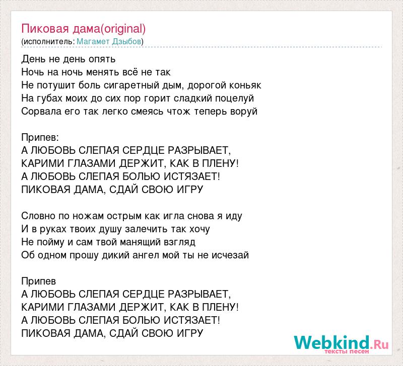 День не день опять Ночь на ночь менять всё не так Не потушит боль сигаретный дым, дорогой коньяк На губах моих до сих пор горит сладкий поцелуй Сорвала его так легко смеясь чтож теперь воруй Припев: А ЛЮБОВЬ СЛЕПАЯ СЕРДЦЕ РАЗРЫВАЕТ, КАРИМИ ГЛАЗАМИ ДЕРЖИТ, КАК В ПЛЕНУ! А ЛЮБОВЬ СЛЕПАЯ БОЛЬЮ ИСТЯЗАЕТ! ПИКОВАЯ ДАМА, СДАЙ СВОЮ ИГРУ Словно по ножам острым как игла снова я иду И в руках твоих душу залечить так хочу Не пойму и сам твой манящий взгляд Об одном прошу дикий ангел мой ты не исчезай Припев А ЛЮБОВЬ СЛЕПАЯ СЕРДЦЕ РАЗРЫВАЕТ, КАРИМИ ГЛАЗАМИ ДЕРЖИТ, КАК В ПЛЕНУ! А ЛЮБОВЬ СЛЕПАЯ БОЛЬЮ ИСТЯЗАЕТ! ПИКОВАЯ ДАМА, СДАЙ СВОЮ ИГРУ
