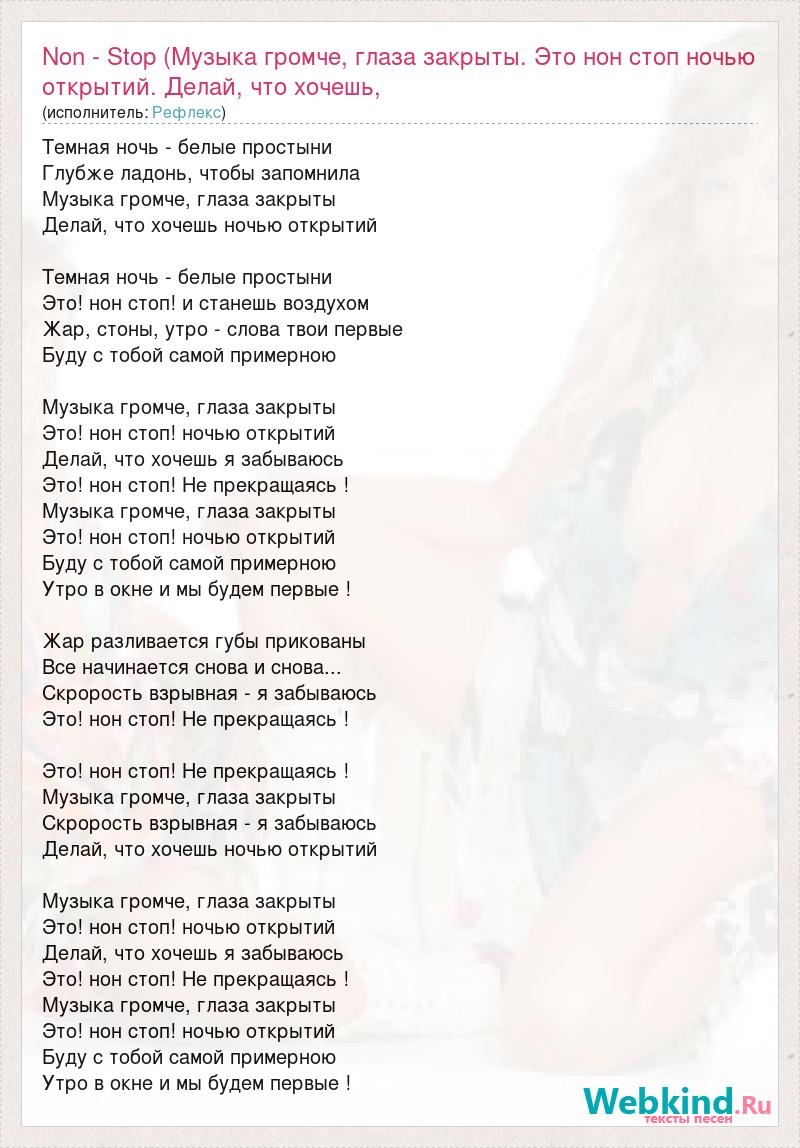 Темная ночь - белые простыни Глубже ладонь, чтобы запомнила Музыка громче, глаза закрыты Делай, что хочешь ночью открытий Темная ночь - белые простыни Это! нон стоп! и станешь воздухом Жар, стоны, утро - слова твои первые Буду с тобой самой примерною Музыка громче, глаза закрыты Это! нон стоп! ночью открытий Делай, что хочешь я забываюсь Это! нон стоп! Не прекращаясь ! Музыка громче, глаза закрыты Это! нон стоп! ночью открытий Буду с тобой самой примерною Утро в окне и мы будем первые ! Жар разливается губы прикованы Все начинается снова и снова... Скрорость взрывная - я забываюсь Это! нон стоп! Не прекращаясь ! Это! нон стоп! Не прекращаясь ! Музыка громче, глаза закрыты Скрорость взрывная - я забываюсь Делай, что хочешь ночью открытий Музыка громче, глаза закрыты Это! нон стоп! ночью открытий Делай, что хочешь я забываюсь Это! нон стоп! Не прекращаясь ! Музыка громче, глаза закрыты Это! нон стоп! ночью открытий Буду с тобой самой примерною Утро в окне и мы будем первые !