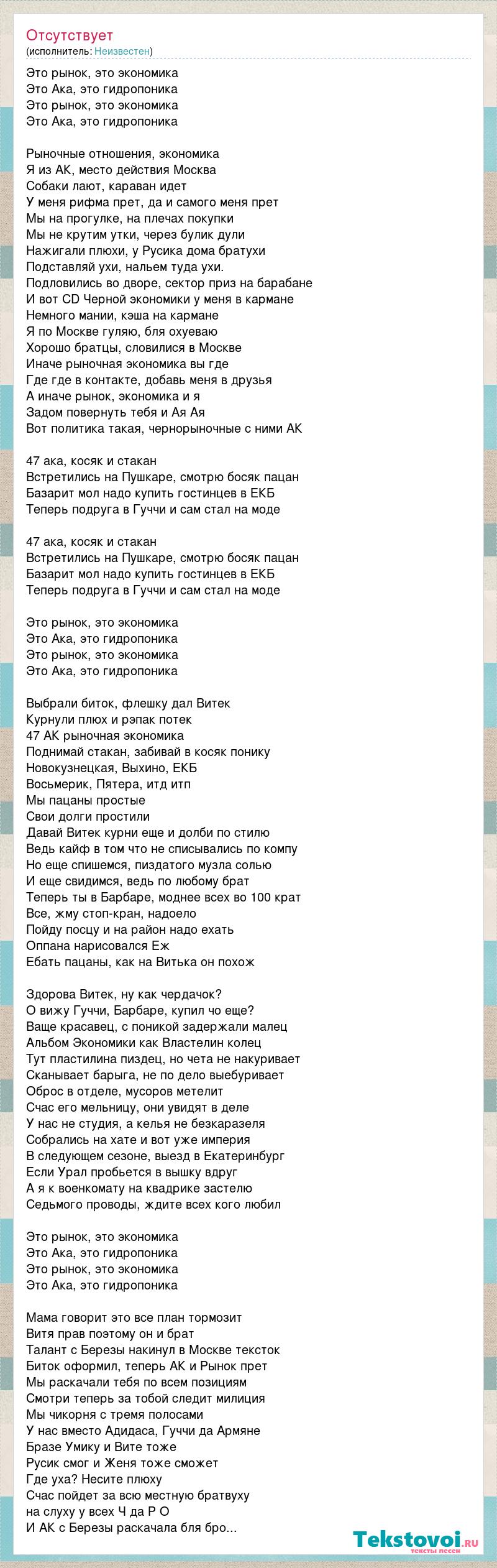Это рынок, это экономика Это Ака, это гидропоника Это рынок, это экономика Это Ака, это гидропоника Рыночные отношения, экономика Я из АК, место действия Москва Собаки лают, караван идет У меня рифма прет, да и самого меня прет Мы на прогулке, на плечах покупки Мы не крутим утки, через булик дули Нажигали плюхи, у Русика дома братухи Подставляй ухи, нальем туда ухи. Подловились во дворе, сектор приз на барабане И вот CD Черной экономики у меня в кармане Немного мании, кэша на кармане Я по Москве гуляю, бля охуеваю Хорошо братцы, словилися в Москве Иначе рыночная экономика вы где Где где в контакте, добавь меня в друзья А иначе рынок, экономика и я Задом повернуть тебя и Ая Ая Вот политика такая, чернорыночные с ними АК 47 ака, косяк и стакан Встретились на Пушкаре, смотрю босяк пацан Базарит мол надо купить гостинцев в ЕКБ Теперь подруга в Гуччи и сам стал на моде 47 ака, косяк и стакан Встретились на Пушкаре, смотрю босяк пацан Базарит мол надо купить гостинцев в ЕКБ Теперь подруга в Гуччи и сам стал на моде Это рынок, это экономика Это Ака, это гидропоника Это рынок, это экономика Это Ака, это гидропоника Выбрали биток, флешку дал Витек Курнули плюх и рэпак потек 47 АК рыночная экономика Поднимай стакан, забивай в косяк понику Новокузнецкая, Выхино, ЕКБ Восьмерик, Пятера, итд итп Мы пацаны простые Свои долги простили Давай Витек курни еще и долби по стилю Ведь кайф в том что не списывались по компу Но еще спишемся, пиздатого музла солью И еще свидимся, ведь по любому брат Теперь ты в Барбаре, моднее всех во 100 крат Все, жму стоп-кран, надоело Пойду посцу и на район надо ехать Оппана нарисовался Еж Ебать пацаны, как на Витька он похож Здорова Витек, ну как чердачок? О вижу Гуччи, Барбаре, купил чо еще? Ваще красавец, с поникой задержали малец Альбом Экономики как Властелин колец Тут пластилина пиздец, но чета не накуривает Сканывает барыга, не по дело выебуривает Оброс в отделе, мусоров метелит Счас его мельницу, они увидят в деле У нас не студия, а келья не безкаразеля Собрались на хате и вот уже империя В следующем сезоне, выезд в Екатеринбург Если Урал пробьется в вышку вдруг А я к военкомату на квадрике застелю Седьмого проводы, ждите всех кого любил Это рынок, это экономика Это Ака, это гидропоника Это рынок, это экономика Это Ака, это гидропоника Мама говорит это все план тормозит Витя прав поэтому он и брат Талант с Березы накинул в Москве тексток Биток оформил, теперь АК и Рынок прет Мы раскачали тебя по всем позициям Смотри теперь за тобой следит милиция Мы чикорня с тремя полосами У нас вместо Адидаса, Гуччи да Армяне Бразе Умику и Вите тоже Русик смог и Женя тоже сможет Где уха? Несите плюху Счас пойдет за всю местную братвуху на слуху у всех Ч да Р О И АК с Березы раскачала бля бро...