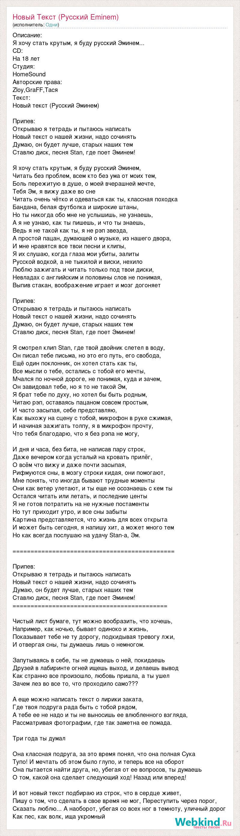 Описание: Я хочу стать крутым, я буду русский Эминем... СD: На 18 лет Студия: HomeSound Авторские права: Zloy,GraFF,Тася Текст: Новый текст (Русский Эминем) Припев: Открываю я тетрадь и пытаюсь написать Новый текст о нашей жизни, надо сочинять Думаю, он будет лучше, старых наших тем Ставлю диск, песня Stan, где поет Эминем! Я хочу стать крутым, я буду русский Эминем, Читать без проблем, всем кто без ума от моих тем, Боль пережитую в душе, о моей вчерашней мечте, Тебя Эм, я вижу даже во сне Читать очень чётко и одеваться как ты, классная походка Бандана, белая футболка и широкие штаны, Но ты никогда обо мне не услышишь, не узнаешь, А я не узнаю, как ты пишешь, и что ты знаешь, Ведь я не такой как ты, я не рэп звезда, А простой пацан, думающей о музыке, из нашего двора, И мне нравятся все твои песни и клипы, Я их слушаю, когда глаза мои убиты, залиты Русской водкой, а не тыкилой и виски, нехило Люблю зажигать и читать только под твои диски, Невладах с английским и половины слов не понимая, Выпив стакан, воображение играет и мозг догоняет Припев: Открываю я тетрадь и пытаюсь написать Новый текст о нашей жизни, надо сочинять Думаю, он будет лучше, старых наших тем Ставлю диск, песня Stan, где поет Эминем! Я смотрел клип Stan, где твой двойник слетел в воду, Он писал тебе письма, но это его путь, его свобода, Ещё один поклонник, он хотел стать как ты, Все мысли о тебе, остались с тобой его мечты, Мчался по ночной дороге, не понимая, куда и зачем, Он завидовал тебе, но я то не такой Эм, Я брат тебе по духу, но хотел бы быть родным, Читаю рэп, оставаясь пацаном совсем простым, И часто засыпая, себе представляю, Как выхожу на сцену с тобой, микрофон в руке сжимая, И начиная зажигать толпу, я в микрофон прочту, Что тебя благодарю, что я без рэпа не могу, И дня и часа, без бита, не написав пару строк, Даже вечером когда усталый на кровать прилёг, О всём что вижу и даже почти засыпая, Рифмуются сны, в мозгу строки кидая, они помогают, Мне понять, что иногда бывают трудные моменты Они как ветер улетают, и ты еще не осознаешь с кем ты Остался читать или летать, и последние центы Я не готов потратить на не нужные постаменты Но тут приходит утро, и все сны забыты Картина представляется, что жизнь для всех открыта И может быть сегодня, я напишу хит, а может много тем Но как всегда послушаю на удачу Stan-а, Эм. ============================================= Припев: Открываю я тетрадь и пытаюсь написать Новый текст о нашей жизни, надо сочинять Думаю, он будет лучше, старых наших тем Ставлю диск, песня Stan, где поет Эминем! =========================================== Чистый лист бумаге, тут можно вообразить, что хочешь, Например, как ночью, бывает одиноко и жизнь, Показывает тебе не ту дорогу, подкидывая тревогу лжи, И отвергая сны, ты думаешь лишь о немногом. Запутываясь в себе, ты не думаешь о ней, покидаешь Друзей в лабиринте огней ищешь выход, и делаешь вывод Как странно все произошло, любовь пришла, а ты ушел Зачем лез во все то, что проходило само??? А еще можно написать текст о лирики заката, Где твоя подруга рада быть с тобой рядом, А тебе ее не надо и ты не выносишь ее влюбленного взгляда, Рассматривая фотографии, где так заметна ее помада. Три года ты думал Она классная подруга, за это время понял, что она полная Сука Тупо! И мечтать об этом было глупо, и теперь все на оборот Она пытается найти друга, но, убегая от ее вопросов, ты думаешь О том, какой она сделает следующий хо