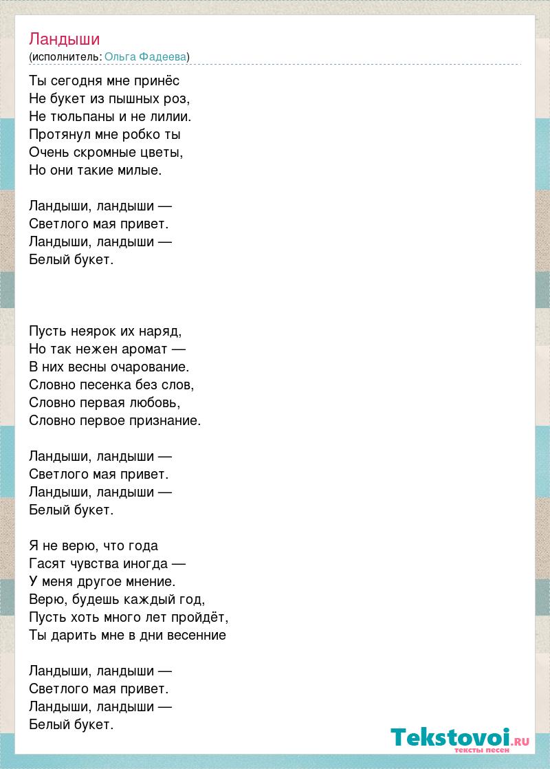 Ты сегодня мне принёс Не букет из пышных роз, Не тюльпаны и не лилии. Протянул мне робко ты Очень скромные цветы, Но они такие милые. Ландыши, ландыши — Светлого мая привет. Ландыши, ландыши — Белый букет. Пусть неярок их наряд, Но так нежен аромат — В них весны очарование. Словно песенка без слов, Словно первая любовь, Словно первое признание. Ландыши, ландыши — Светлого мая привет. Ландыши, ландыши — Белый букет. Я не верю, что года Гасят чувства иногда — У меня другое мнение. Верю, будешь каждый год, Пусть хоть много лет пройдёт, Ты дарить мне в дни весенние Ландыши, ландыши — Светлого мая привет. Ландыши, ландыши — Белый букет.