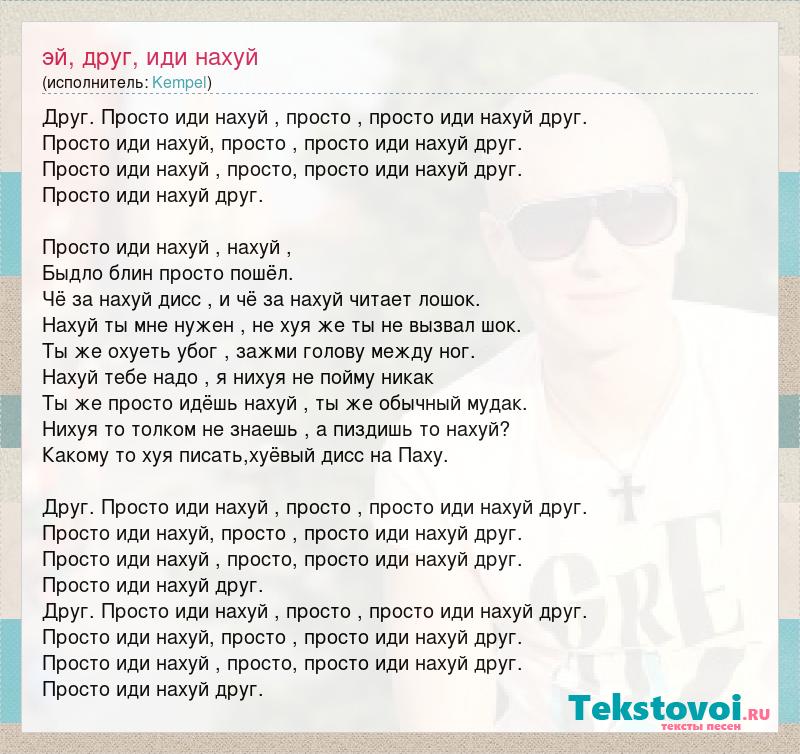 Друг. Просто иди нахуй , просто , просто иди нахуй друг. Просто иди нахуй, просто , просто иди нахуй друг. Просто иди нахуй , просто, просто иди нахуй друг. Просто иди нахуй друг. Просто иди нахуй , нахуй , Быдло блин просто пошёл. Чё за нахуй дисс , и чё за нахуй читает лошок. Нахуй ты мне нужен , не хуя же ты не вызвал шок. Ты же охуеть убог , зажми голову между ног. Нахуй тебе надо , я нихуя не пойму никак Ты же просто идёшь нахуй , ты же обычный мудак. Нихуя то толком не знаешь , а пиздишь то нахуй? Какому то хуя писать,хуёвый дисс на Паху. Друг. Просто иди нахуй , просто , просто иди нахуй друг. Просто иди нахуй, просто , просто иди нахуй друг. Просто иди нахуй , просто, просто иди нахуй друг. Просто иди нахуй друг. Друг. Просто иди нахуй , просто , просто иди нахуй друг. Просто иди нахуй, просто , просто иди нахуй друг. Просто иди нахуй , просто, просто иди нахуй друг. Просто иди нахуй друг.