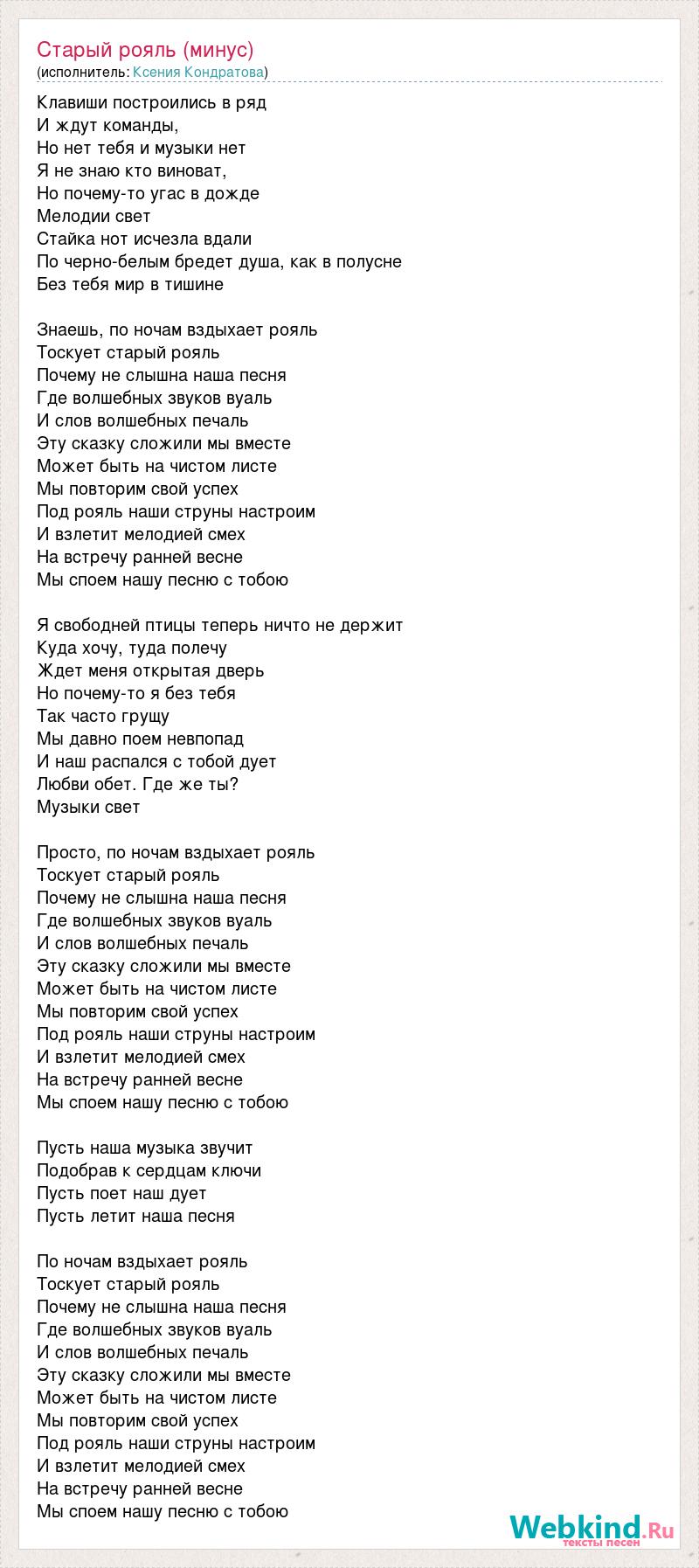 Клавиши построились в ряд И ждут команды, Но нет тебя и музыки нет Я не знаю кто виноват, Но почему-то угас в дожде Мелодии свет Стайка нот исчезла вдали По черно-белым бредет душа, как в полусне Без тебя мир в тишине Знаешь, по ночам вздыхает рояль Тоскует старый рояль Почему не слышна наша песня Где волшебных звуков вуаль И слов волшебных печаль Эту сказку сложили мы вместе Может быть на чистом листе Мы повторим свой успех Под рояль наши струны настроим И взлетит мелодией смех На встречу ранней весне Мы споем нашу песню с тобою Я свободней птицы теперь ничто не держит Куда хочу, туда полечу Ждет меня открытая дверь Но почему-то я без тебя Так часто грущу Мы давно поем невпопад И наш распался с тобой дует Любви обет. Где же ты? Музыки свет Просто, по ночам вздыхает рояль Тоскует старый рояль Почему не слышна наша песня Где волшебных звуков вуаль И слов волшебных печаль Эту сказку сложили мы вместе Может быть на чистом листе Мы повторим свой успех Под рояль наши струны настроим И взлетит мелодией смех На встречу ранней весне Мы споем нашу песню с тобою Пусть наша музыка звучит Подобрав к сердцам ключи Пусть поет наш дует Пусть летит наша песня По ночам вздыхает рояль Тоскует старый рояль Почему не слышна наша песня Где волшебных звуков вуаль И слов волшебных печаль Эту сказку сложили мы вместе Может быть на чистом листе Мы повторим свой успех Под рояль наши струны настроим И взлетит мелодией смех На встречу ранней весне Мы споем нашу песню с тобою