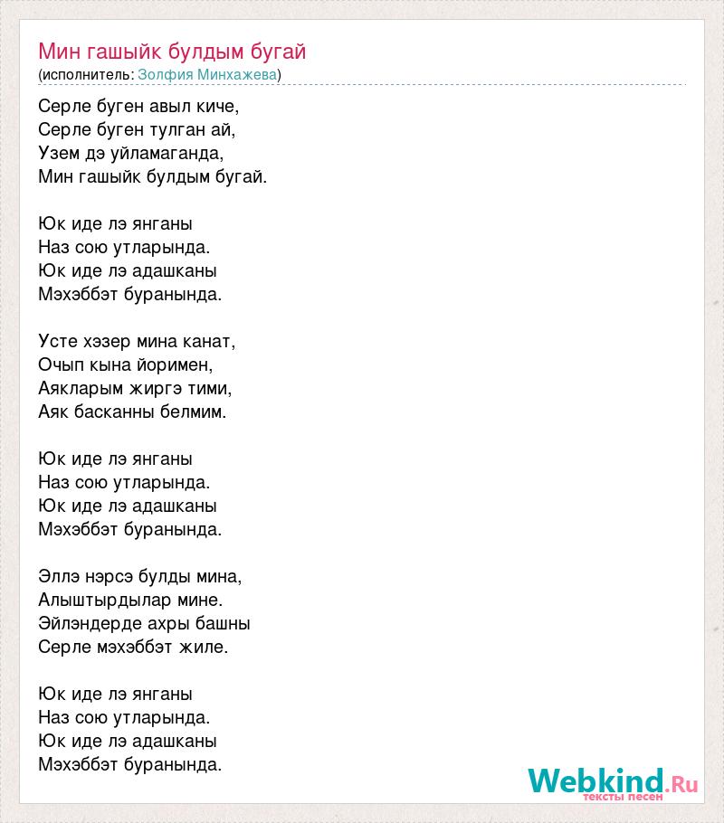 Серле буген авыл киче, Серле буген тулган ай, Узем дэ уйламаганда, Мин гашыйк булдым бугай. Юк иде лэ янганы Наз сою утларында. Юк иде лэ адашканы Мэхэббэт буранында. Усте хэзер мина канат, Очып кына йоримен, Аякларым жиргэ тими, Аяк басканны белмим. Юк иде лэ янганы Наз сою утларында. Юк иде лэ адашканы Мэхэббэт буранында. Эллэ нэрсэ булды мина, Алыштырдылар мине. Эйлэндерде ахры башны Серле мэхэббэт жиле. Юк иде лэ янганы Наз сою утларында. Юк иде лэ адашканы Мэхэббэт буранында.