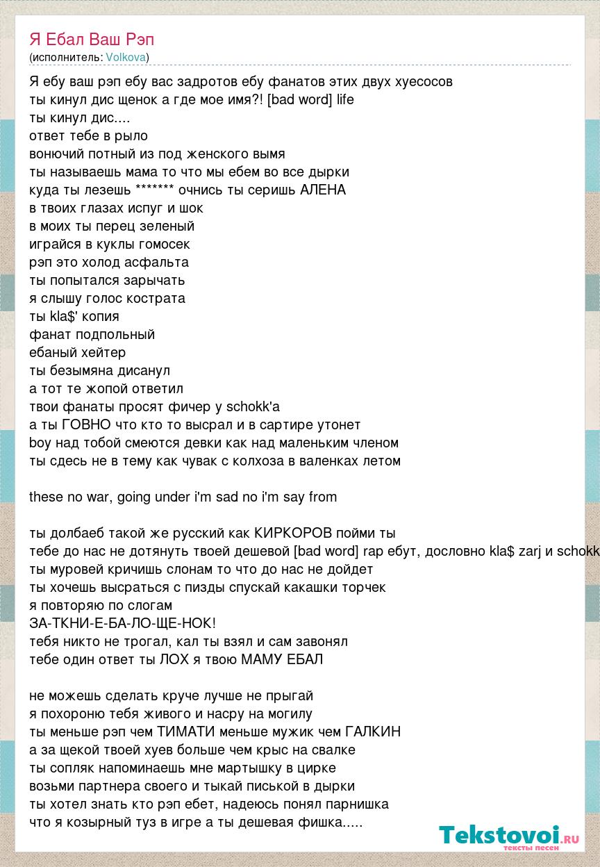 Я ебу ваш рэп ебу вас задротов ебу фанатов этих двух хуесосов ты кинул дис щенок а где мое имя?! [bad word] life ты кинул дис.... ответ тебе в рыло вонючий потный из под женского вымя ты называешь мама то что мы ебем во все дырки куда ты лезешь ******* очнись ты серишь АЛЕНА в твоих глазах испуг и шок в моих ты перец зеленый играйся в куклы гомосек рэп это холод асфальта ты попытался зарычать я слышу голос кострата ты kla$' копия фанат подпольный ебаный хейтер ты безымяна дисанул а тот те жопой ответил твои фанаты просят фичер у schokk'a а ты ГОВНО что кто то высрал и в сартире утонет boy над тобой смеются девки как над маленьким членом ты сдесь не в тему как чувак с колхоза в валенках летом these no war, going under i'm sad no i'm say from ты долбаеб такой же русский как КИРКОРОВ пойми ты тебе до нас не дотянуть твоей дешевой зачиткой rus rap ебут, дословно kla$ zarj и schokk ты муровей кричишь слонам то что до нас не дойдет ты хочешь высраться с пизды спускай какашки торчек я повторяю по слогам ЗА-ТКНИ-Е-БА-ЛО-ЩЕ-НОК! тебя никто не трогал, кал ты взял и сам завонял тебе один ответ ты ЛОХ я твою МАМУ ЕБАЛ не можешь сделать круче лучше не прыгай я похороню тебя живого и насру на могилу ты меньше рэп чем ТИМАТИ меньше мужик чем ГАЛКИН а за щекой твоей хуев больше чем крыс на свалке ты сопляк напоминаешь мне мартышку в цирке возьми партнера своего и тыкай писькой в дырки ты хотел знать кто рэп ебет, надеюсь понял парнишка что я козырный туз в игре а ты дешевая фишка.....