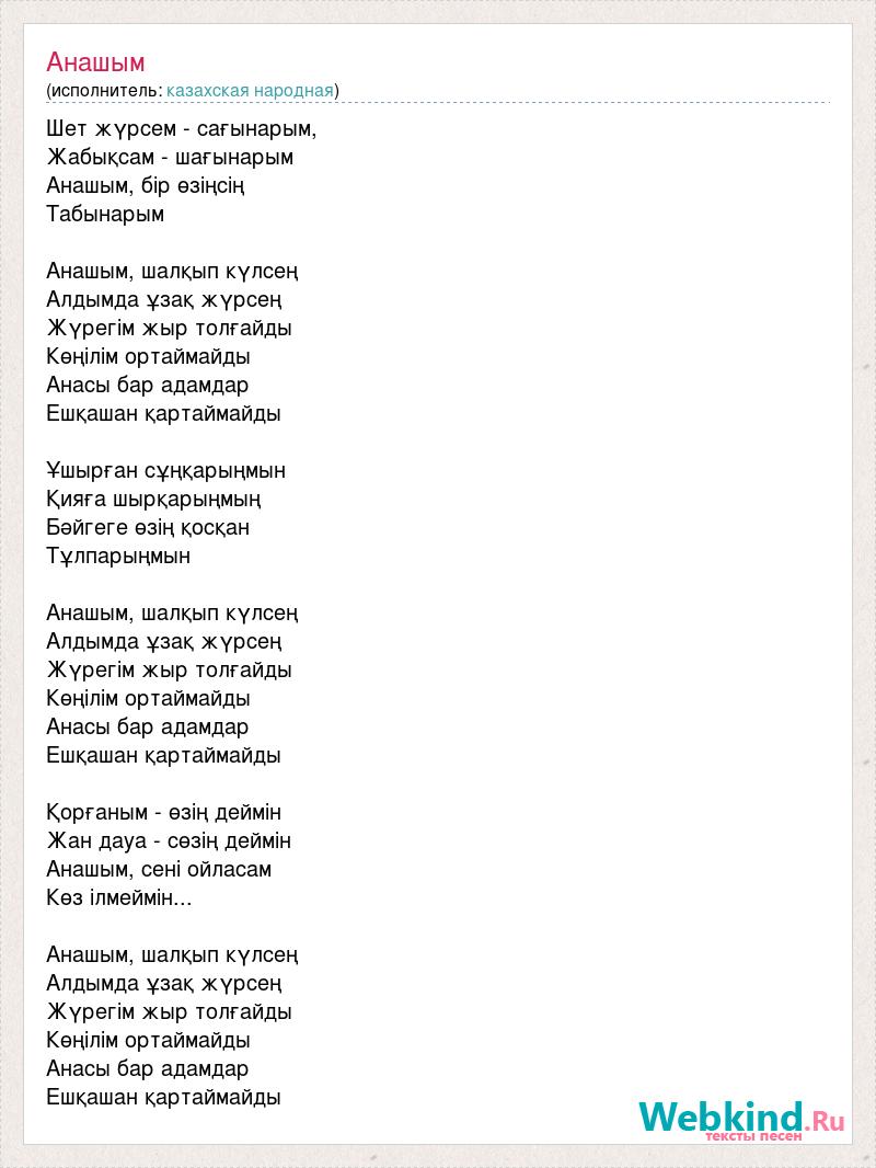 Шет жүрсем - сағынарым, Жабықсам - шағынарым Анашым, бір өзіңсің Табынарым Анашым, шалқып күлсең Алдымда ұзақ жүрсең Жүрегім жыр толғайды Көңілім ортаймайды Анасы бар адамдар Ешқашан қартаймайды Ұшырған сұңқарыңмын Қияға шырқарыңмың Бәйгеге өзің қосқан Тұлпарыңмын Анашым, шалқып күлсең Алдымда ұзақ жүрсең Жүрегім жыр толғайды Көңілім ортаймайды Анасы бар адамдар Ешқашан қартаймайды Қорғаным - өзің деймін Жан дауа - сөзің деймін Анашым, сені ойласам Көз ілмеймін... Анашым, шалқып күлсең Алдымда ұзақ жүрсең Жүрегім жыр толғайды Көңілім ортаймайды Анасы бар адамдар Ешқашан қартаймайды