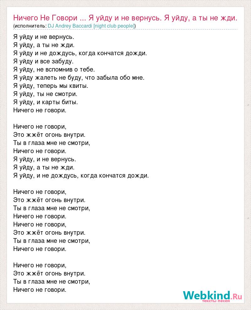 Я уйду и не вернусь. Я уйду, а ты не жди. Я уйду и не дождусь, когда кончатся дожди. Я уйду и все забуду. Я уйду, не вспомнив о тебе. Я уйду жалеть не буду, что забыла обо мне. Я уйду, теперь мы квиты. Я уйду, ты не смотри. Я уйду, и карты биты. Ничего не говори. Ничего не говори, Это жжёт огонь внутри. Ты в глаза мне не смотри, Ничего не говори. Я уйду, и не вернусь. Я уйду, а ты не жди. Я уйду, и не дождусь, когда кончатся дожди. Ничего не говори, Это жжёт огонь внутри. Ты в глаза мне не смотри, Ничего не говори. Ничего не говори, Это жжёт огонь внутри. Ты в глаза мне не смотри, Ничего не говори. Ничего не говори, Это жжёт огонь внутри. Ты в глаза мне не смотри, Ничего не говори.