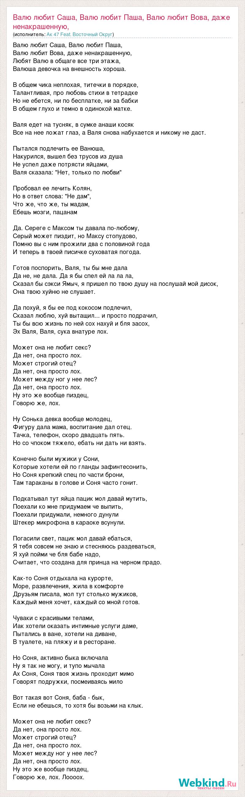 Главная→Исполнители→Ак 47 Feat. Восточный Округ→Валю любит Саша, Валю любит Паша, Валю любит Вова, даже ненакрашенную,