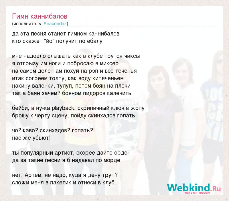 да эта песня станет гимном каннибалов кто скажет "йо" получит по ебалу мне надоело слышать как в клубе трутся чиксы я отгрызу им ноги и побросаю в миксер на самом деле нам похуй на рэп и все теченья итак согреем толпу, как воду кипяченьем накину валенки, тулуп, потом боян на плечи так а баян зачем? бояном пидоров калечить бейби, а ну-ка playback, скрипичный ключ в жопу брошу к черту сцену, пойду скинхэдов гопать чо? каво? скинхэдов? гопать?! нас же убьют! ты популярный артист, скорее дайте орден да за такие песни я б надавал по морде нет, Артем, не надо, куда я дену труп? сложи меня в пакетик и отнеси в клуб.