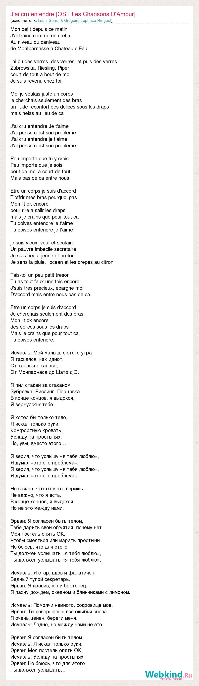 Mon petit depuis ce matin J'ai traine comme un cretin Au niveau du caniveau de Montparnasse a Chateau d'Eau j'ai bu des verres, des verres, et puis des verres Zubrowska, Riesling, Piper court de tout a bout de moi Je suis revenu chez toi Moi je voulais juste un corps je cherchais seulement des bras un lit de reconfort des delices sous les draps mais helas au lieu de ca J'ai cru entendre Je t'aime J'ai pense c'est son probleme J'ai cru entendre je t'aime J'ai pense c'est son probleme Peu importe que tu y crois Peu importe que je sois bout de moi a court de tout Mais pas de ca entre nous Etre un corps je suis d'accord T'offrir mes bras pourquoi pas Mon lit ok encore pour rire a salir les draps mais je crains que pour tout ca Tu doives entendre je t'aime Tu doives entendre je t'aime je suis vieux, veuf et sectaire Un pauvre imbecile secretaire Je suis beau, jeune et breton Je sens la pluie, l'ocean et les crepes au citron Tais-toi un peu petit tresor Tu as tout faux une fois encore J'suis tres precieux, epargne moi D'accord mais entre nous pas de ca Etre un corps je suis d'accord Je cherchais seulement des bras Mon lit ok encore des delices sous les draps Mais je crains que pour tout ca Tu doives entendre. Исмаэль: Мой малыш, с этого утра Я таскался, как идиот, От канавы к канаве, От Монпарнаса до Шато д'О. Я пил стакан за стаканом, Зубровка, Рислинг, Перцовка. В конце концов, я выдохся, Я вернулся к тебе. Я хотел бы только тело, Я искал только руки, Комфортную кровать, Усладу на простынях, Но, увы, вместо этого… Я верил, что услышу «я тебя люблю», Я думал «это его проблема». Я верил, что услышу «я тебя люблю», Я думал «это его проблема». Не важно, что ты в это веришь, Не важно, что я есть. В конце концов, я выдохся, Но не это между нами. Эрван: Я согласен быть телом, Тебе дарить свои объятия, почему нет. Моя постель опять ОК, Чтобы смеяться или марать простыни. Но боюсь, что для этого Ты должен услышать «я тебя люблю», Ты должен услышать «я тебя люблю». Исмаэль: Я стар, вдов и фанатичен, Бедный тупой секретарь. Эрван: Я красив, юн и бретонец, Я пахну дождем, океаном и блинчиками с лимоном. Исмаэль: Помолчи немного, сокровище мое, Эрван: Ты совершаешь все ошибки снова Я очень ценен, береги меня. Исмаэль: Ладно, но между нами не это. Эрван: Я согласен быть телом. Исмаэль: Я искал только руки. Эрван: Моя постель опять ОК. Исмаэль: Усладу на простынях. Эрван: Но боюсь, что для этого Ты должен услышать…