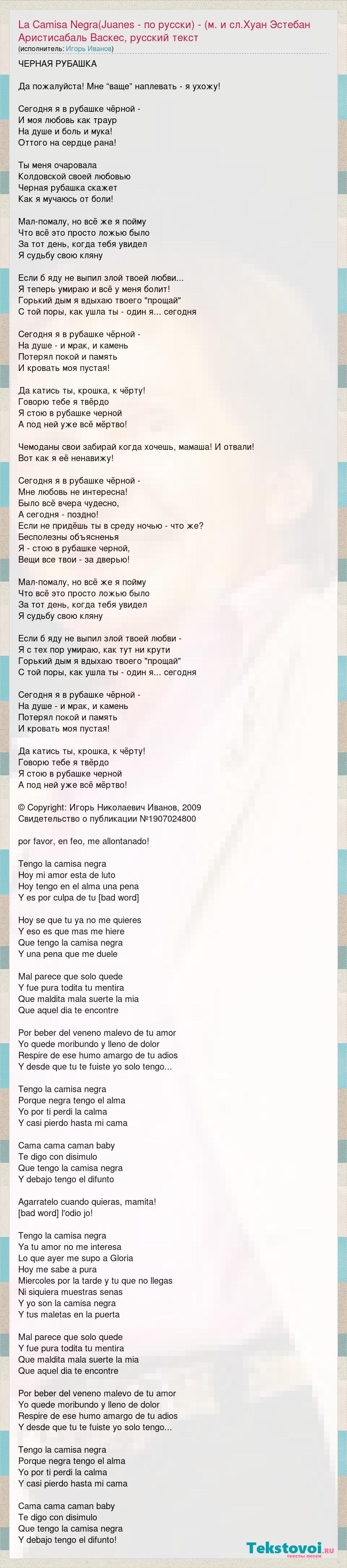 ЧЕРНАЯ РУБАШКА Да пожалуйста! Мне “ваще” наплевать - я ухожу! Сегодня я в рубашке чёрной - И моя любовь как траур На душе и боль и мука! Оттого на сердце рана! Ты меня очаровала Колдовской своей любовью Черная рубашка скажет Как я мучаюсь от боли! Мал-помалу, но всё же я пойму Что всё это просто ложью было За тот день, когда тебя увидел Я судьбу свою кляну Если б яду не выпил злой твоей любви... Я теперь умираю и всё у меня болит! Горький дым я вдыхаю твоего "прощай" С той поры, как ушла ты - один я... сегодня Сегодня я в рубашке чёрной - На душе - и мрак, и камень Потерял покой и память И кровать моя пустая! Да катись ты, крошка, к чёрту! Говорю тебе я твёрдо Я стою в рубашке черной А под ней уже всё мёртво! Чемоданы свои забирай когда хочешь, мамаша! И отвали! Вот как я её ненавижу! Сегодня я в рубашке чёрной - Мне любовь не интересна! Было всё вчера чудесно, А сегодня - поздно! Если не придёшь ты в среду ночью - что же? Бесполезны объясненья Я - стою в рубашке черной, Вещи все твои - за дверью! Мал-помалу, но всё же я пойму Что всё это просто ложью было За тот день, когда тебя увидел Я судьбу свою кляну Если б яду не выпил злой твоей любви - Я с тех пор умираю, как тут ни крути Горький дым я вдыхаю твоего "прощай" С той поры, как ушла ты - один я... сегодня Сегодня я в рубашке чёрной - На душе - и мрак, и камень Потерял покой и память И кровать моя пустая! Да катись ты, крошка, к чёрту! Говорю тебе я твёрдо Я стою в рубашке черной А под ней уже всё мёртво! © Copyright: Игорь Николаевич Иванов, 2009 Свидетельство о публикации №1907024800 por favor, en feo, me allontanado! Tengo la camisa negra Hoy mi amor esta de luto Hoy tengo en el alma una pena Y es por culpa de tu [bad word] Hoy se que tu ya no me quieres Y eso es que mas me hiere Que tengo la camisa negra Y una pena que me duele Mal parece que solo quede Y fue pura todita tu mentira Que maldita mala suerte la mia Que aquel dia te encontre Por beber del veneno malevo de tu amor Yo quede moribundo y lleno de dolor Respire de ese humo amargo de tu adios Y desde que tu te fuiste yo solo tengo... Tengo la camisa negra Porque negra tengo el alma Yo por ti perdi la calma Y casi pierdo hasta mi cama Cama cama caman baby Te digo con disimulo Que tengo la camisa negra Y debajo tengo el difunto Agarratelo cuando quieras, mamita! [bad word] l'odio jo! Tengo la camisa negra Ya tu amor no me interesa Lo que ayer me supo a Gloria Hoy me sabe a pura Miercoles por la tarde y tu que no llegas Ni siquiera muestras senas Y yo son la camisa negra Y tus maletas en la puerta Mal parece que solo quede Y fue pura todita tu mentira Que maldita mala suerte la mia Que aquel dia te encontre Por beber del veneno malevo de tu amor Yo quede moribundo y lleno de dolor Respire de ese humo amargo de tu adios Y desde que tu te fuiste yo solo tengo... Tengo la camisa negra Porque negra tengo el alma Yo por ti perdi la calma Y casi pierdo hasta mi cama Cama cama caman baby Te digo con disimulo Que tengo la camisa negra Y debajo tengo el difunto!