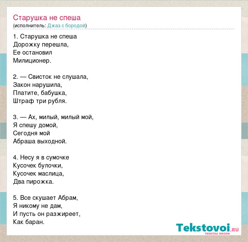 1. Старушка не спеша Дорожку перешла, Ее остановил Милиционер. 2. — Свисток не слушала, Закон нарушила, Платите, бабушка, Штраф три рубля. 3. — Ах, милый, милый мой, Я спешу домой, Сегодня мой Абраша выходной. 4. Несу я в сумочке Кусочек булочки, Кусочек маслица, Два пирожка. 5. Все скушает Абрам, Я никому не дам, И пусть он разжиреет, Как баран.
