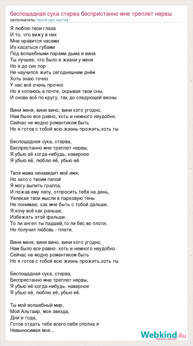 Я люблю твои глаза И то, что вижу в них Мне нравится часами Их касаться губами Под волшебными парами дыма и вина Ты лучшее, что было в жизни у меня Но я до сих пор Не научился жить сегодняшним днём Хоть знаю точно У нас всё очень прочно Но я копаюсь в почте, скрывая твои сны, И снова всё по кругу, так до следующей весны Вини меня, вини вино, вини кого угодно, Нам было все равно, хоть и немного неудобно. Сейчас не модно романтиком быть Но я готов с тобой всю жизнь прожить,хоть ты Беспощадная сука, стерва, Беспрестанно мне треплет нервы, Я убью её когда-нибудь, наверное Я убью её, люблю её, убью её. Твоя мама ненавидит моё имя, Но зато с твоим папой Я могу выпить граппа, И пожав ему лапу, отпросить тебя на день, Увлекая твои мысли в парковую тень Не понимаю, как мне быть с тобой дальше, Я хочу всё как раньше, Избежать этой фальши. То ли ангел ты падший,то ли бес во плоти, Но получил любовь - плати. Вини меня, вини вино, вини кого угодно, Нам было все равно, хоть и немного неудобно. Сейчас не модно романтиком быть Но я готов с тобой всю жизнь прожить,хоть ты Беспощадная сука, стерва, Беспрестанно мне треплет нервы, Я убью её когда-нибудь, наверное Я убью её, люблю её, убью её. Ты мой волшебный мир, Мой Альтаир, моя звезда, Дни и года, Готов отдать тебе всего себя сполна я Невыносимая моя...