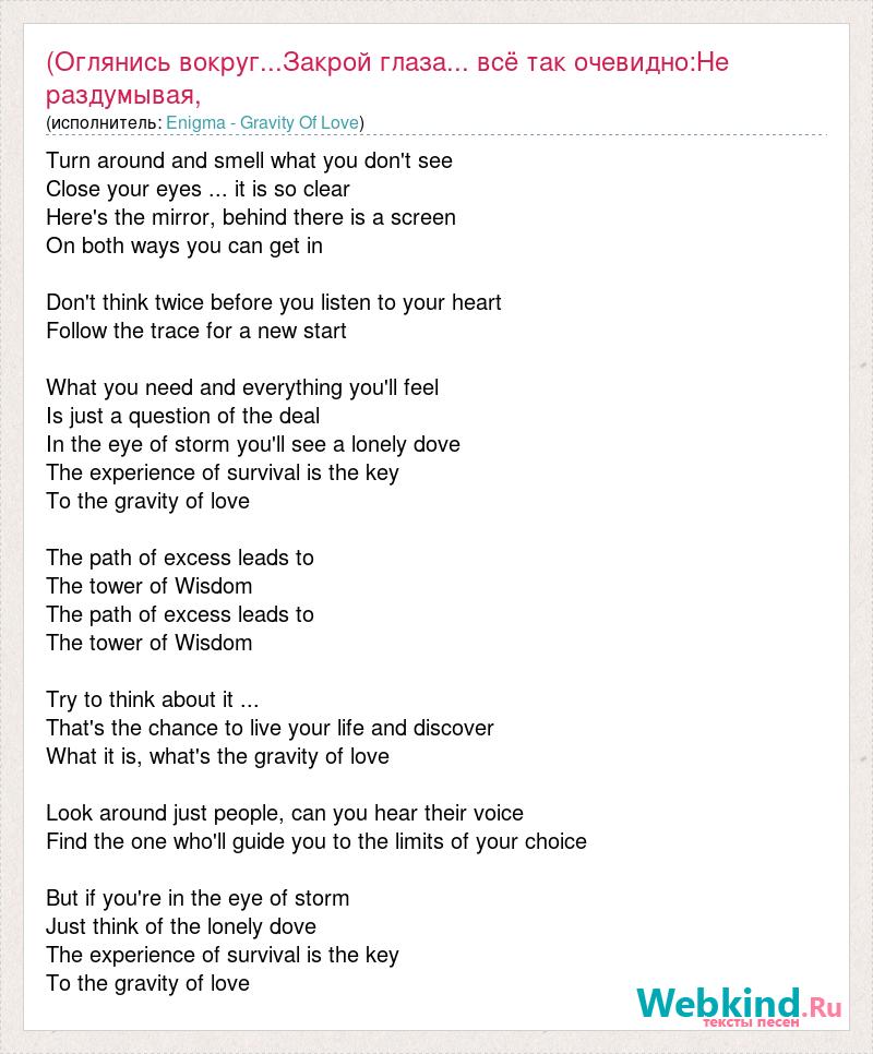Главная→Исполнители→Enigma - Gravity Of Love→(Оглянись вокруг...Закрой глаза... всё так очевидно:Не раздумывая, слушай
