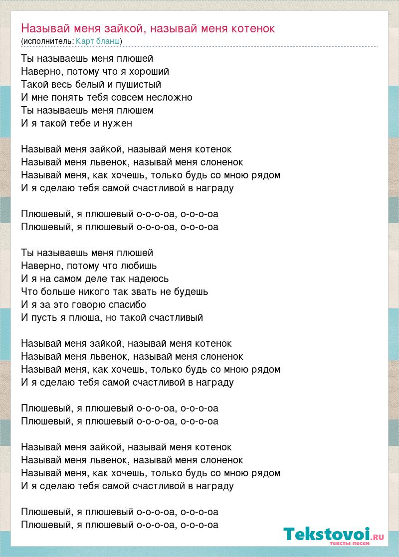 Ты называешь меня плюшей Наверно, потому что я хороший Такой весь белый и пушистый И мне понять тебя совсем несложно Ты называешь меня плюшем И я такой тебе и нужен Называй меня зайкой, называй меня котенок Называй меня львенок, называй меня слоненок Называй меня, как хочешь, только будь со мною рядом И я сделаю тебя самой счастливой в награду Плюшевый, я плюшевый о-о-о-оа, о-о-о-оа Плюшевый, я плюшевый о-о-о-оа, о-о-о-оа Ты называешь меня плюшей Наверно, потому что любишь И я на самом деле так надеюсь Что больше никого так звать не будешь И я за это говорю спасибо И пусть я плюша, но такой счастливый Называй меня зайкой, называй меня котенок Называй меня львенок, называй меня слоненок Называй меня, как хочешь, только будь со мною рядом И я сделаю тебя самой счастливой в награду Плюшевый, я плюшевый о-о-о-оа, о-о-о-оа Плюшевый, я плюшевый о-о-о-оа, о-о-о-оа Называй меня зайкой, называй меня котенок Называй меня львенок, называй меня слоненок Называй меня, как хочешь, только будь со мною рядом И я сделаю тебя самой счастливой в награду Плюшевый, я плюшевый о-о-о-оа, о-о-о-оа Плюшевый, я плюшевый о-о-о-оа, о-о-о-оа