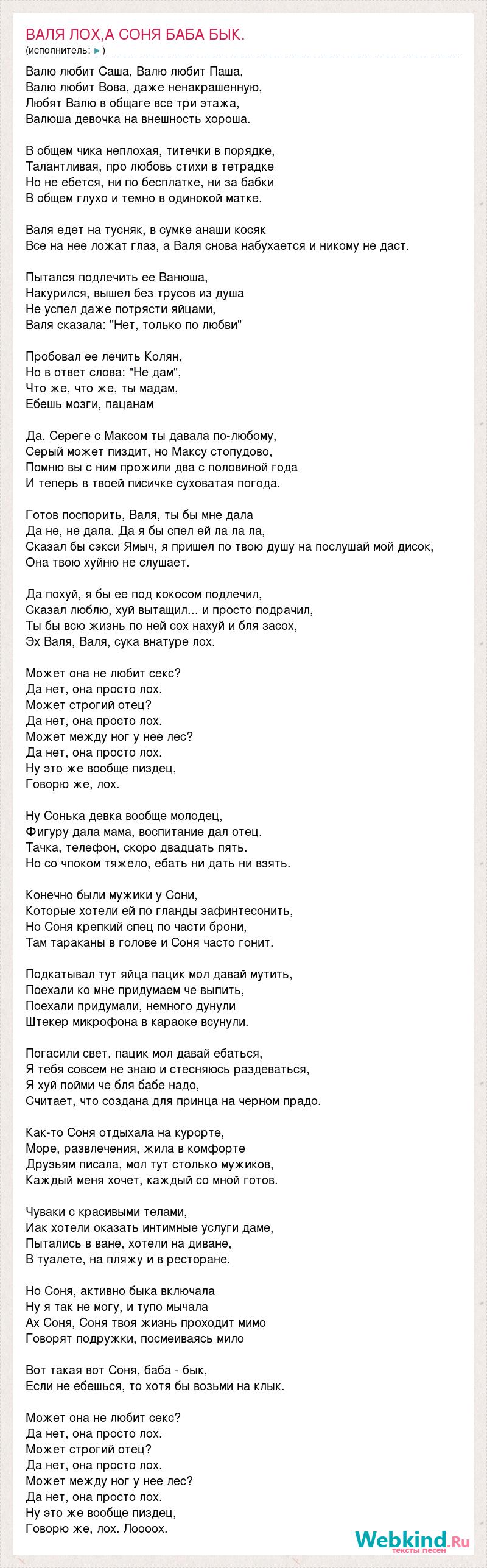 Валю любит Саша, Валю любит Паша, Валю любит Вова, даже ненакрашенную, Любят Валю в общаге все три этажа, Валюша девочка на внешность хороша. В общем чика неплохая, титечки в порядке, Талантливая, про любовь стихи в тетрадке Но не ебется, ни по бесплатке, ни за бабки В общем глухо и темно в одинокой матке. Валя едет на тусняк, в сумке анаши косяк Все на нее ложат глаз, а Валя снова набухается и никому не даст. Пытался подлечить ее Ванюша, Накурился, вышел без трусов из душа Не успел даже потрясти яйцами, Валя сказала: "Нет, только по любви" Пробовал ее лечить Колян, Но в ответ слова: "Не дам", Что же, что же, ты мадам, Ебешь мозги, пацанам Да. Сереге с Максом ты давала по-любому, Серый может пиздит, но Максу стопудово, Помню вы с ним прожили два с половиной года И теперь в твоей писичке суховатая погода. Готов поспорить, Валя, ты бы мне дала Да не, не дала. Да я бы спел ей ла ла ла, Сказал бы сэкси Ямыч, я пришел по твою душу на послушай мой дисок, Она твою хуйню не слушает. Да похуй, я бы ее под кокосом подлечил, Сказал люблю, хуй вытащил... и просто подрачил, Ты бы всю жизнь по ней сох нахуй и бля засох, Эх Валя, Валя, сука внатуре лох. Может она не любит секс? Да нет, она просто лох. Может строгий отец? Да нет, она просто лох. Может между ног у нее лес? Да нет, она просто лох. Ну это же вообще пиздец, Говорю же, лох. Ну Сонька девка вообще молодец, Фигуру дала мама, воспитание дал отец. Тачка, телефон, скоро двадцать пять. Но со чпоком тяжело, ебать ни дать ни взять. Конечно были мужики у Сони, Которые хотели ей по гланды зафинтесонить, Но Соня крепкий спец по части брони, Там тараканы в голове и Соня часто гонит. Подкатывал тут яйца пацик мол давай мутить, Поехали ко мне придумаем че выпить, Поехали придумали, немного дунули Штекер микрофона в караоке всунули. Погасили свет, пацик мол давай ебаться, Я тебя совсем не знаю и стесняюсь раздеваться, Я хуй пойми че бля бабе надо, Считает, что создана для принца на черном прадо. Как-то Соня отдыхала на курорте, Море, развлечения, жила в комфорте Друзьям писала, мол тут столько мужиков, Каждый меня хочет, каждый со мной готов. Чуваки с красивыми телами, Иак хотели оказать интимные услуги даме, Пытались в ване, хотели на диване, В туалете, на пляжу и в ресторане. Но Соня, активно быка включала Ну я так не могу, и тупо мычала Ах Соня, Соня твоя жизнь проходит мимо Говорят подружки, посмеиваясь мило Вот такая вот Соня, баба - бык, Если не ебешься, то хотя бы возьми на клык. Может она не любит секс? Да нет, она просто лох. Может строгий отец? Да нет, она просто лох. Может между ног у нее лес? Да нет, она просто лох. Ну это же вообще пиздец, Говорю же, лох. Лоооох.