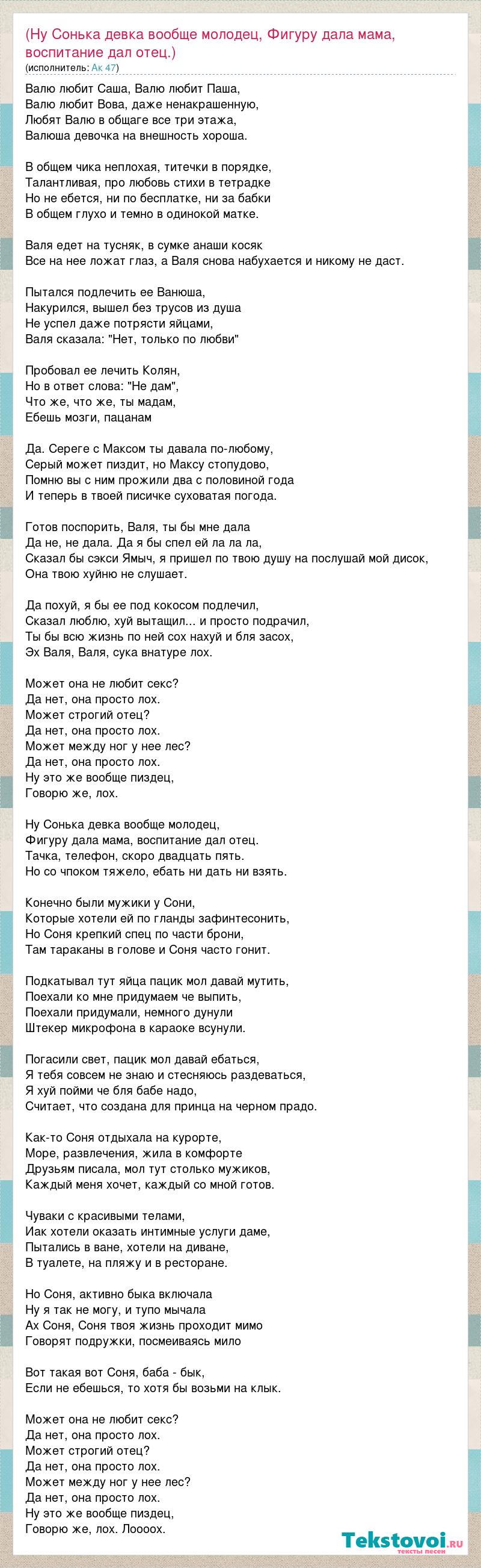 Валю любит Саша, Валю любит Паша, Валю любит Вова, даже ненакрашенную, Любят Валю в общаге все три этажа, Валюша девочка на внешность хороша. В общем чика неплохая, титечки в порядке, Талантливая, про любовь стихи в тетрадке Но не ебется, ни по бесплатке, ни за бабки В общем глухо и темно в одинокой матке. Валя едет на тусняк, в сумке анаши косяк Все на нее ложат глаз, а Валя снова набухается и никому не даст. Пытался подлечить ее Ванюша, Накурился, вышел без трусов из душа Не успел даже потрясти яйцами, Валя сказала: "Нет, только по любви" Пробовал ее лечить Колян, Но в ответ слова: "Не дам", Что же, что же, ты мадам, Ебешь мозги, пацанам Да. Сереге с Максом ты давала по-любому, Серый может пиздит, но Максу стопудово, Помню вы с ним прожили два с половиной года И теперь в твоей писичке суховатая погода. Готов поспорить, Валя, ты бы мне дала Да не, не дала. Да я бы спел ей ла ла ла, Сказал бы сэкси Ямыч, я пришел по твою душу на послушай мой дисок, Она твою хуйню не слушает. Да похуй, я бы ее под кокосом подлечил, Сказал люблю, хуй вытащил... и просто подрачил, Ты бы всю жизнь по ней сох нахуй и бля засох, Эх Валя, Валя, сука внатуре лох. Может она не любит секс? Да нет, она просто лох. Может строгий отец? Да нет, она просто лох. Может между ног у нее лес? Да нет, она просто лох. Ну это же вообще пиздец, Говорю же, лох. Ну Сонька девка вообще молодец, Фигуру дала мама, воспитание дал отец. Тачка, телефон, скоро двадцать пять. Но со чпоком тяжело, ебать ни дать ни взять. Конечно были мужики у Сони, Которые хотели ей по гланды зафинтесонить, Но Соня крепкий спец по части брони, Там тараканы в голове и Соня часто гонит. Подкатывал тут яйца пацик мол давай мутить, Поехали ко мне придумаем че выпить, Поехали придумали, немного дунули Штекер микрофона в караоке всунули. Погасили свет, пацик мол давай ебаться, Я тебя совсем не знаю и стесняюсь раздеваться, Я хуй пойми че бля бабе надо, Считает, что создана для принца на черном прадо. Как-то Соня отдыхала на курорте, Море, развлечения, жила в комфорте Друзьям писала, мол тут столько мужиков, Каждый меня хочет, каждый со мной готов. Чуваки с красивыми телами, Иак хотели оказать интимные услуги даме, Пытались в ване, хотели на диване, В туалете, на пляжу и в ресторане. Но Соня, активно быка включала Ну я так не могу, и тупо мычала Ах Соня, Соня твоя жизнь проходит мимо Говорят подружки, посмеиваясь мило Вот такая вот Соня, баба - бык, Если не ебешься, то хотя бы возьми на клык. Может она не любит секс? Да нет, она просто лох. Может строгий отец? Да нет, она просто лох. Может между ног у нее лес? Да нет, она просто лох. Ну это же вообще пиздец, Говорю же, лох. Лоооох.