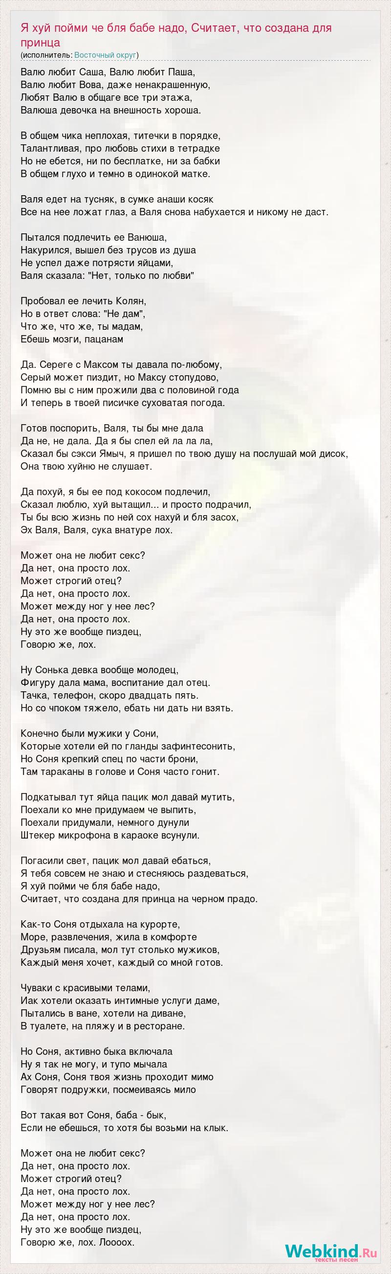 Главная→Исполнители→Восточный Округ→Я хуй пойми че бля бабе надо, Считает, что создана для принца на черном пр
