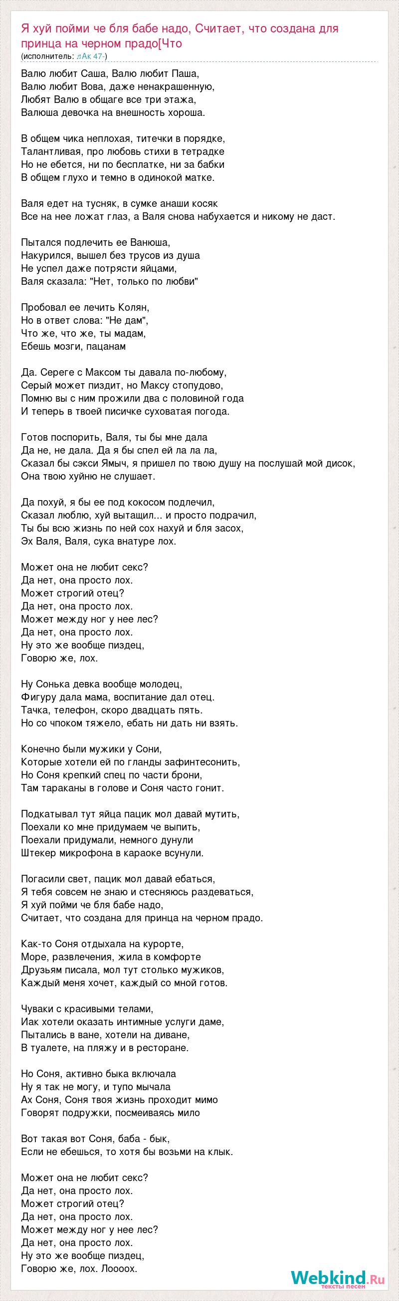 Главная→Исполнители→♬Ак 47-→Я хуй пойми че бля бабе надо, Считает, что создана для принца на черном пр