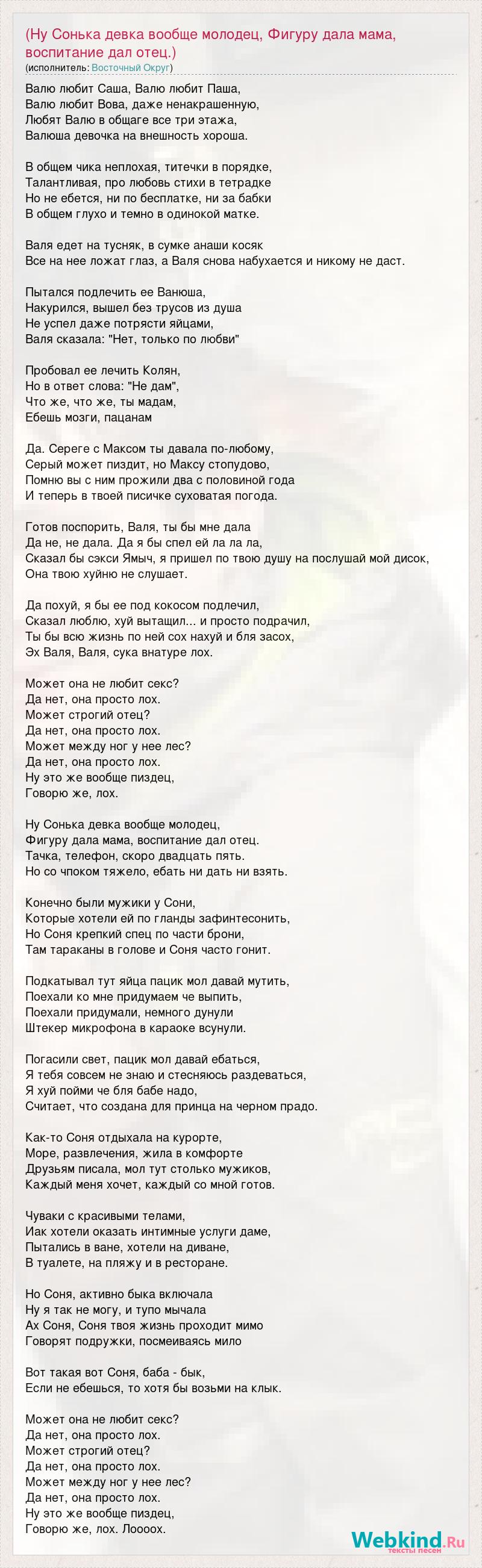 Главная→Исполнители→Восточный Округ→(Ну Сонька девка вообще молодец, Фигуру дала мама, воспитание дал отец.