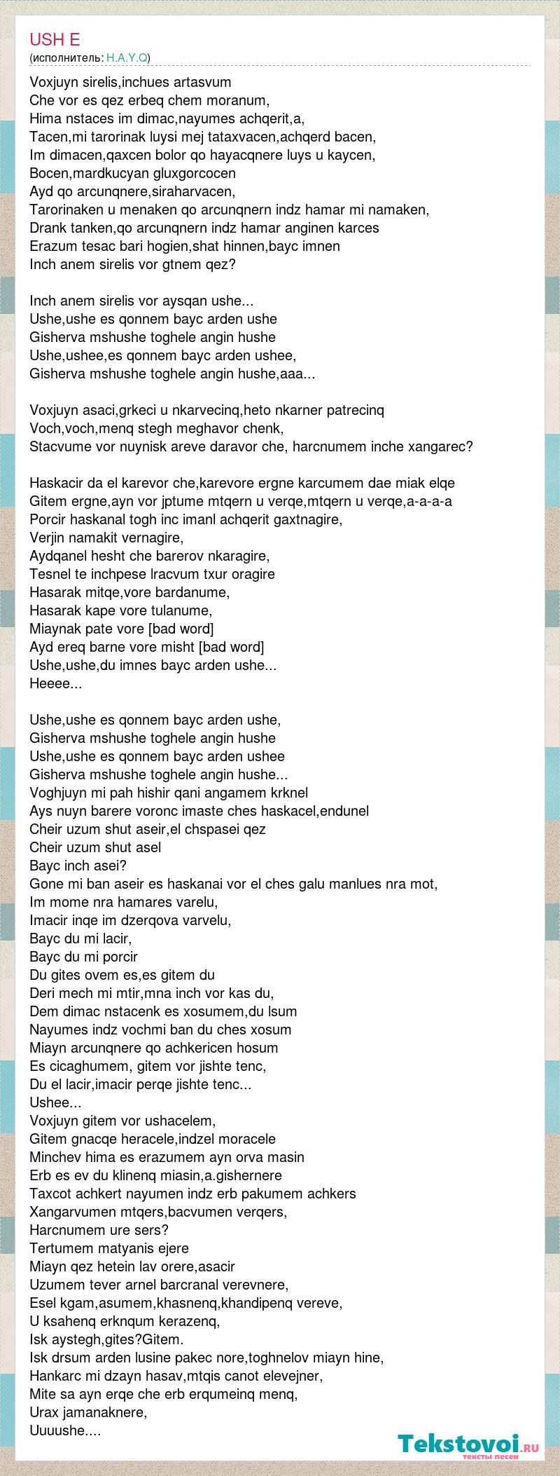 Voxjuyn sirelis,inchues artasvum Che vor es qez erbeq chem moranum, Hima nstaces im dimac,nayumes achqerit,a, Tacen,mi tarorinak luysi mej tataxvacen,achqerd bacen, Im dimacen,qaxcen bolor qo hayacqnere luys u kaycen, Bocen,mardkucyan gluxgorcocen Ayd qo arcunqnere,siraharvacen, Tarorinaken u menaken qo arcunqnern indz hamar mi namaken, Drank tanken,qo arcunqnern indz hamar anginen karces Erazum tesac bari hogien,shat hinnen,bayc imnen Inch anem sirelis vor gtnem qez? Inch anem sirelis vor aysqan ushe... Ushe,ushe es qonnem bayc arden ushe Gisherva mshushe toghele angin hushe Ushe,ushee,es qonnem bayc arden ushee, Gisherva mshushe toghele angin hushe,aaa... Voxjuyn asaci,grkeci u nkarvecinq,heto nkarner patrecinq Voch,voch,menq stegh meghavor chenk, Stacvume vor nuynisk areve daravor che, harcnumem inche xangarec? Haskacir da el karevor che,karevore ergne karcumem dae miak elqe Gitem ergne,ayn vor jptume mtqern u verqe,mtqern u verqe,a-a-a-a Porcir haskanal togh inc imanl achqerit gaxtnagire, Verjin namakit vernagire, Aydqanel hesht che barerov nkaragire, Tesnel te inchpese lracvum txur oragire Hasarak mitqe,vore bardanume, Hasarak kape vore tulanume, Miaynak pate vore xangarume, Ayd ereq barne vore misht aprume, Ushe,ushe,du imnes bayc arden ushe... Heeee... Ushe,ushe es qonnem bayc arden ushe, Gisherva mshushe toghele angin hushe Ushe,ushe es qonnem bayc arden ushee Gisherva mshushe toghele angin hushe... Voghjuyn mi pah hishir qani angamem krknel Ays nuyn barere voronc imaste ches haskacel,endunel Cheir uzum shut aseir,el chspasei qez Cheir uzum shut asel Bayc inch asei? Gone mi ban aseir es haskanai vor el ches galu manlues nra mot, Im mome nra hamares varelu, Imacir inqe im dzerqova varvelu, Bayc du mi lacir, Bayc du mi porcir Du gites ovem es,es gitem du Deri mech mi mtir,mna inch vor kas du, Dem dimac nstacenk es xosumem,du lsum Nayumes indz vochmi ban du ches xosum Miayn arcunqnere qo achkericen hosum Es cicaghumem, gitem vor jishte tenc, Du el lacir,imacir perqe jishte tenc... Ushee... Voxjuyn gitem vor ushacelem, Gitem gnacqe heracele,indzel moracele Minchev hima es erazumem ayn orva masin Erb es ev du klinenq miasin,a.gishernere Taxcot achkert nayumen indz erb pakumem achkers Xangarvumen mtqers,bacvumen verqers, Harcnumem ure sers? Tertumem matyanis ejere Miayn qez hetein lav orere,asacir Uzumem tever arnel barcranal verevnere, Esel kgam,asumem,khasnenq,khandipenq vereve, U ksahenq erknqum kerazenq, Isk aystegh,gites?Gitem. Isk drsum arden lusine pakec nore,toghnelov miayn hine, Hankarc mi dzayn hasav,mtqis canot elevejner, Mite sa ayn erqe che erb erqumeinq menq, Urax jamanaknere, Uuuushe....